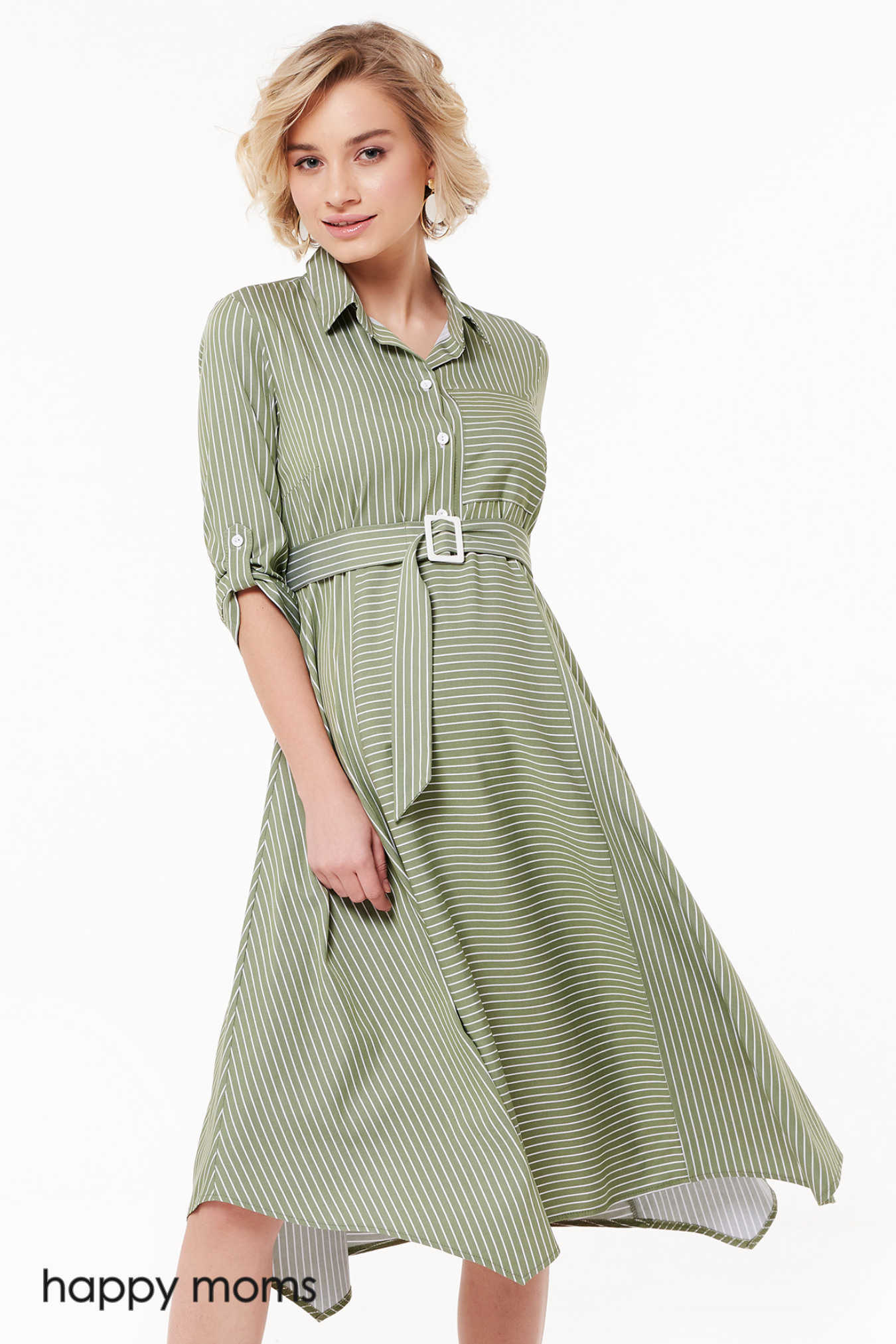 Платье из тенсела. Ткань легкая, приятная к телу, прекрасно подходит для теплого сезона. Сдержанный цвет ткани оттеняется тонкой светлой полоской, ей вторят белые пуговицы на планке и пряжка на широком тканевом поясе. У платья рубашечный воротник, квадратный накладной карман в районе груди и рукава