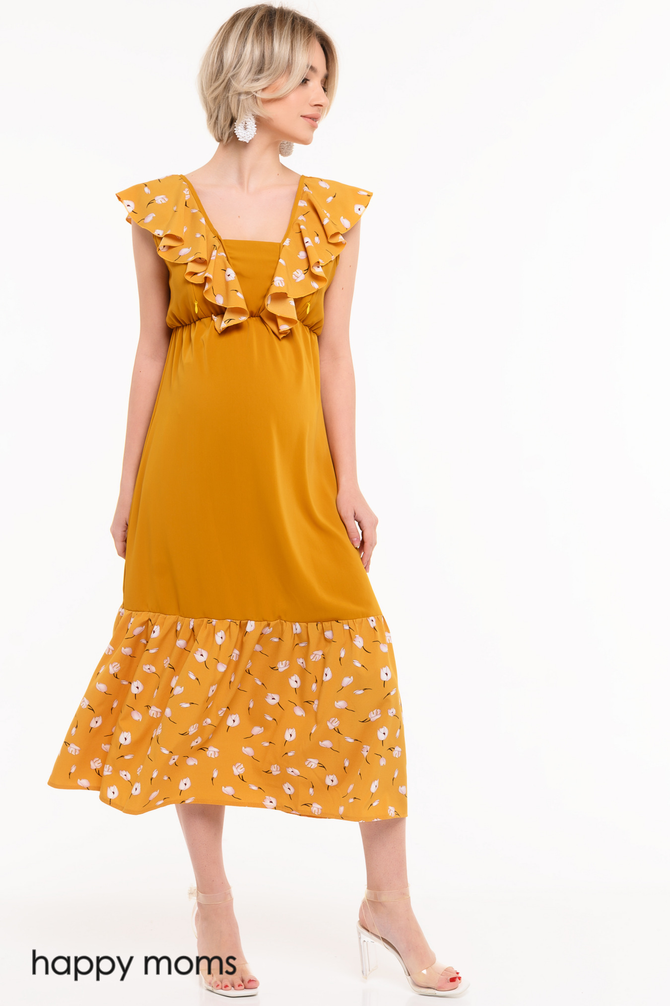 Комбинированное летнее платье в теплом «медовом» оттенке. Однотонная основа красиво разбавляется принтованными воланами и по низу модели. Крой платья прямой, полуоблегающий, слегка завышенная талия посажена на резинку. За счет этого модель легко трансформируется под любой объем животика, не стесняет движений. Ткань легкая, рассчитанная на жаркую погоду. Платье можно обыгрывать разной по стилю обувью, дополнять женственный образ нейтральными полуспортивными балетками или элегантными босоножкам на каблуке.