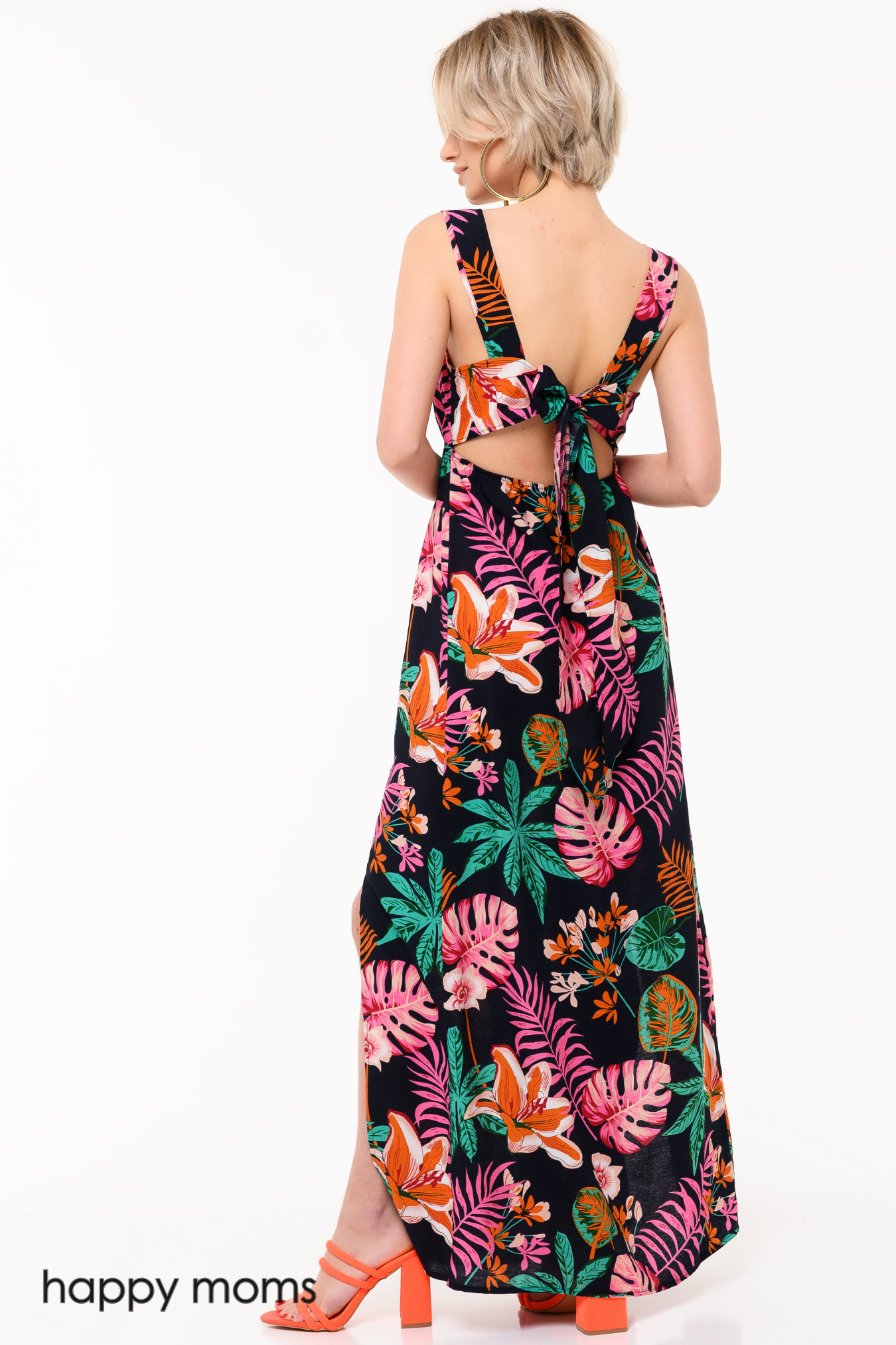 Платье с тропическим принтом и открытой спинкой. Длина макси, глубокие разрезы спереди. Талия завышена и посажена на резинку, за счет этого модель можно носить на всем сроке беременности и после появления малыша. Достаточно лаконичный вырез компенсируется роскошным кроем сзади: длинные бретели и узкая горизонтальная перемычка красиво открывают спину. Вся конструкция фиксируется широким, ниспадающим бантом. Ткань легкая, идеальная для жаркого лета. Модель шикарно смотрится с обувью на каблуке, но и с обувью на низком ходу получается симпатичный вариант для комфортного ежедневного использования.