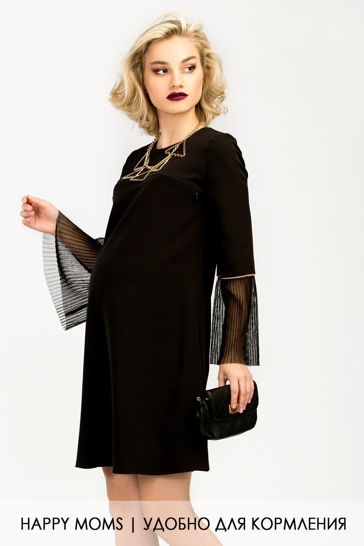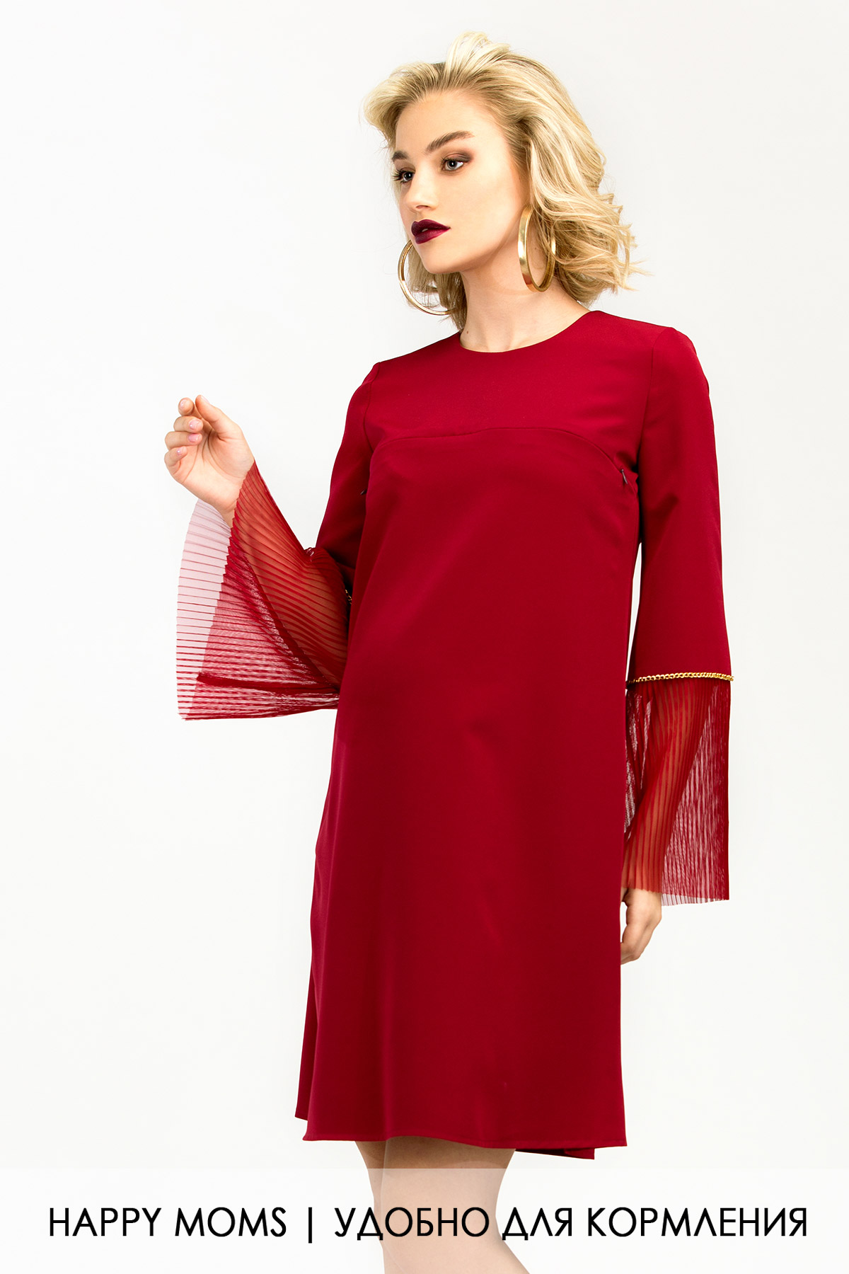 Платье для будущих и кормящих мам. Изюминка фасона – рукав-колокол с гофрированной манжетой и золотым декором. На фоне лаконичной основы платья он смотрится изумительно, создавая идеальный вариант для вечернего «лука». А-образный свободный силуэт дает необходимый объем на животик, маме будет удобно и в период беременности, и после родов – в модели предусмотрен «секрет кормления», спрятанный в шве отрезной кокетки. Платье великолепно в сочетании с классической обувью на каблуке, яркость оттенка не мешает комбинировать его с такой же яркой, роскошной парой туфель.