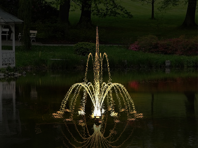 Плавающий фонтан "Вулкан" – это классическое название старинного трехуровневого фонтана. Композиция состоит из высокой центральной струи, окруженной восемью струями высотой около 2/3 от центральной, которые в свою очередь окружены восемью еще более низкими и широкими потоками. В вечернее время в сочетании с многоцветной подсветкой Вулкан выглядит потрясающе. Этот плавающий фонтан станет прекрасным украшением любого пруда.