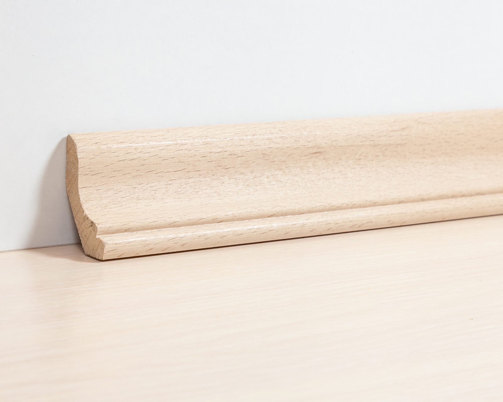 Плинтус из массива бука Галтель имеет размеры 30 мм по ширине и 50 мм по стене. Фигурные планки закрывают промежуток между стеной и полом, образованный при реставрации паркета и настиле других деревянных полов.