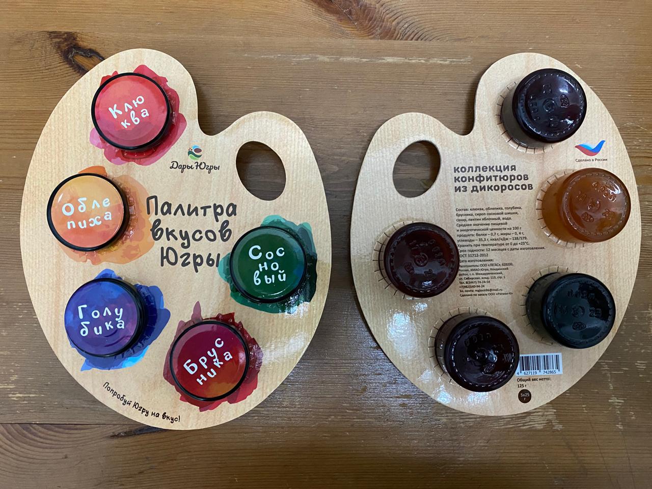 Подарочный набор "Палитра Вкусов Югры" (5 конфитюров), от компании Регион-К "Дары Югры". Место сбора дикоросов Ханты-Мансийский автономный округ - Югра. Состав: конфитюр из молодых сосновых шишек, конфитюр из брусники, конфитюр из клюквы, конфитюр из голубики, конфитюр из облепихи.