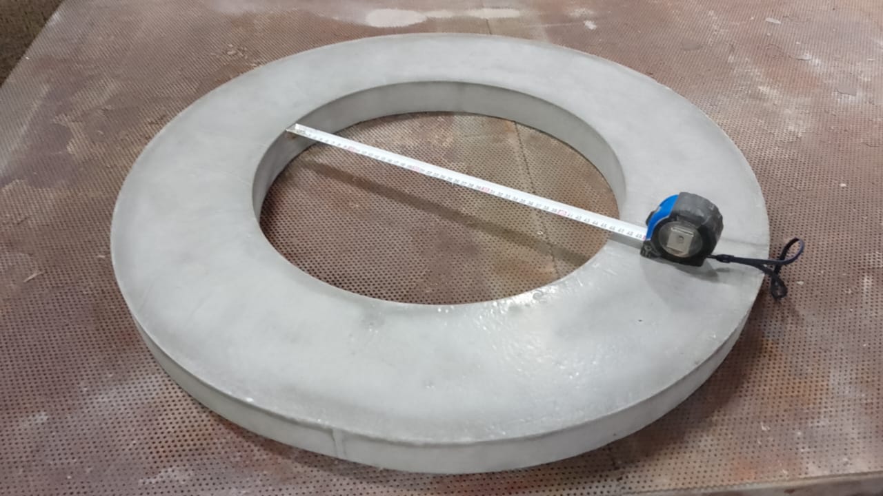 Подина плита кольцо жаростойкое изделие до 1650 С огнеупор произведен по чертежу размер Д 780 Д1 460 х 50 мм, кажущаяся плотность = 2400 кг/м3, формованный огнеупор с образованием кордиерита на обжиге, высокопрочный, устойчивый как к температурной эррозии, так и к механическим воздействиям, применен Заказчиком для подовой футеровки индуктора и для верхней закрывающей плиты индуктора.