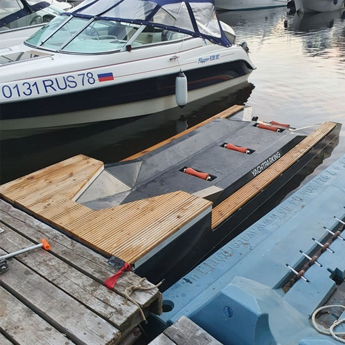 Модель сухой стоянки для гидроцикла размером 4х1,5 м. Для легкого подъема и спуска судна в зоне стоянки предусмотрены полиуретановые ролики.