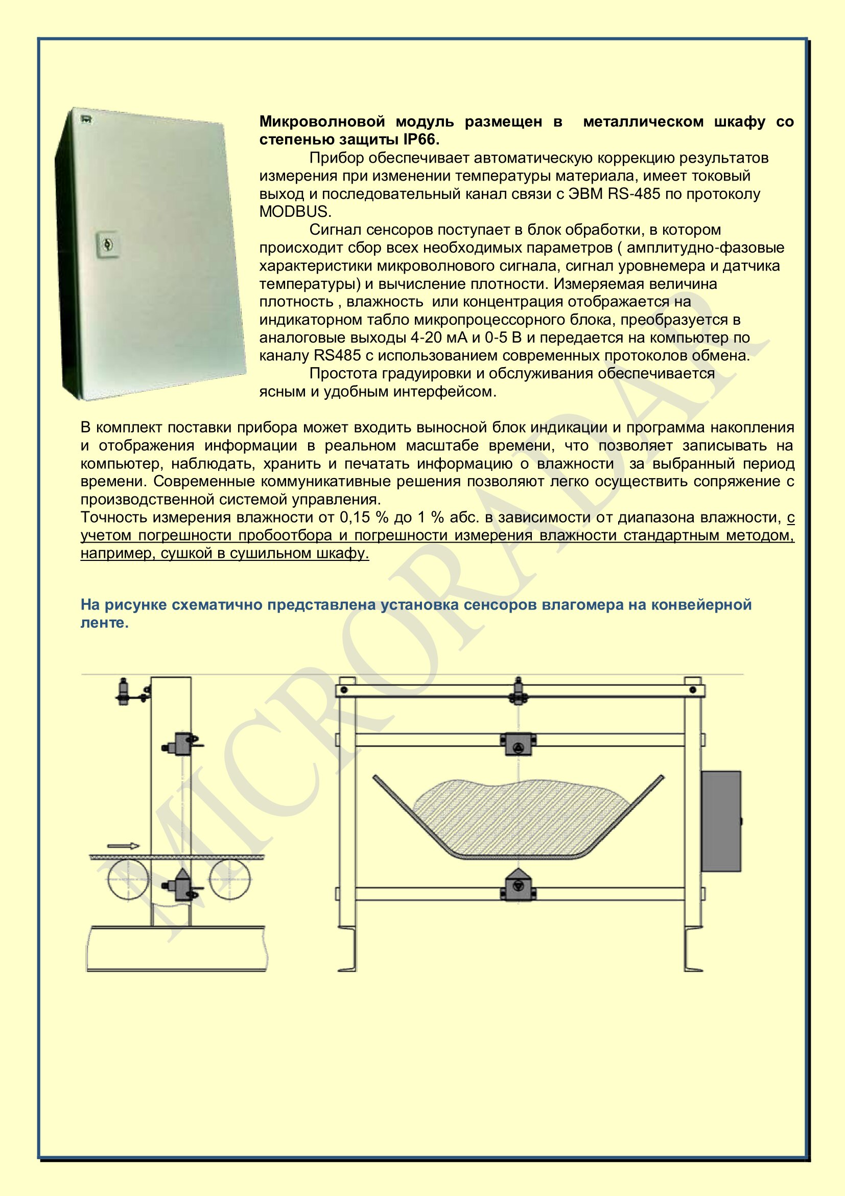 Микроволновой поточный бесконтактный влагомер МИКРОРАДАР112К13К предназначен для непрерывного измерения влажности руд и концентратов черных и цветных металлов, угля и других высоко абразивных материалов в транспортных отоках на ленточных конвейерах, в