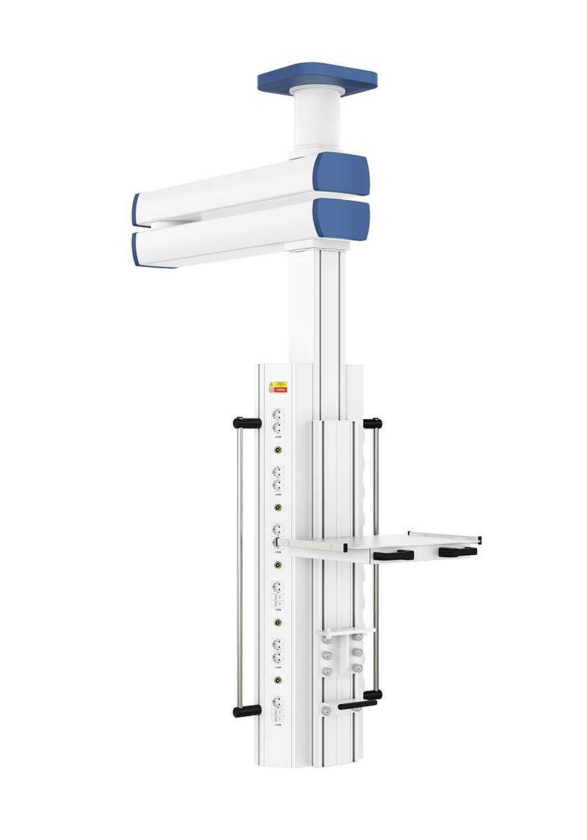 Потолочная медицинская двухплечевая консоль CADUCEUS (Кадуцей) C2-VE с 2-мя поворотными плечами, длиной до 1200 мм каждое, и вращающимся вертикальным шкафом источников медицинских газов и электропитания, позволяет эффективно организовать рабочее место медицинского персонала с возможностью свободного доступа к пациенту.