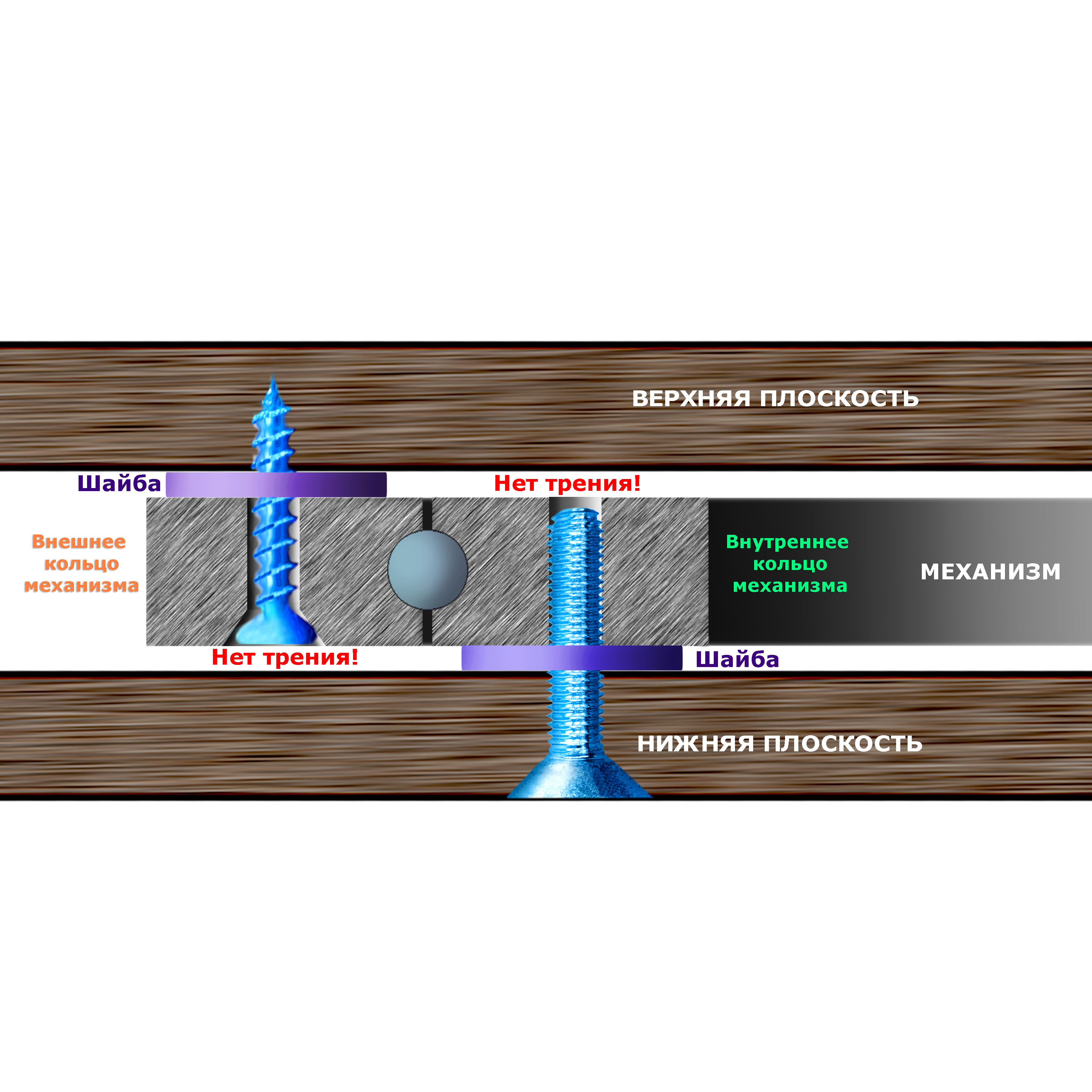 Важно обеспечить небольшую дистанцию между механизмом и плоскостями, чтобы не было трения при вращении. Для этого подложите шайбы (есть в комплекте).