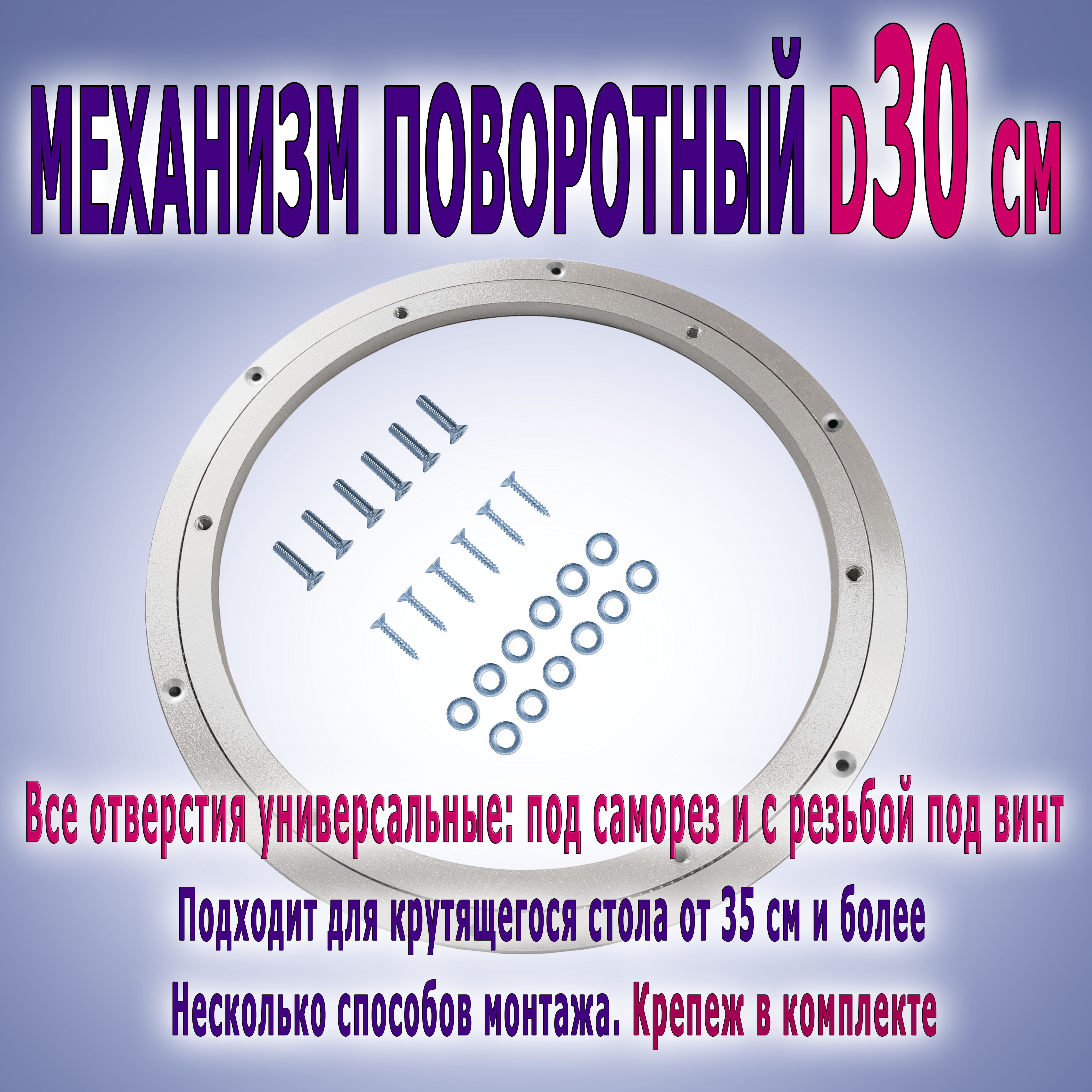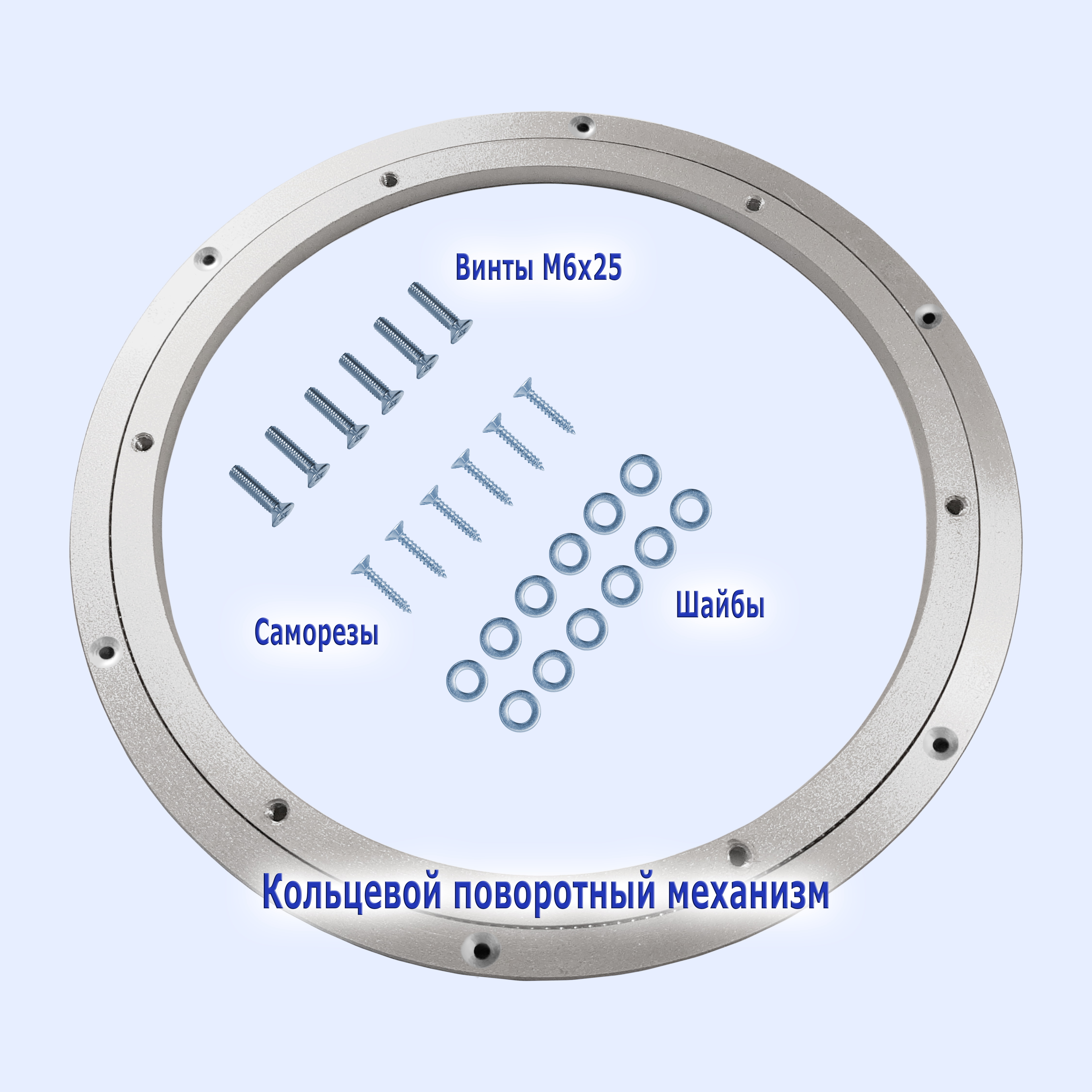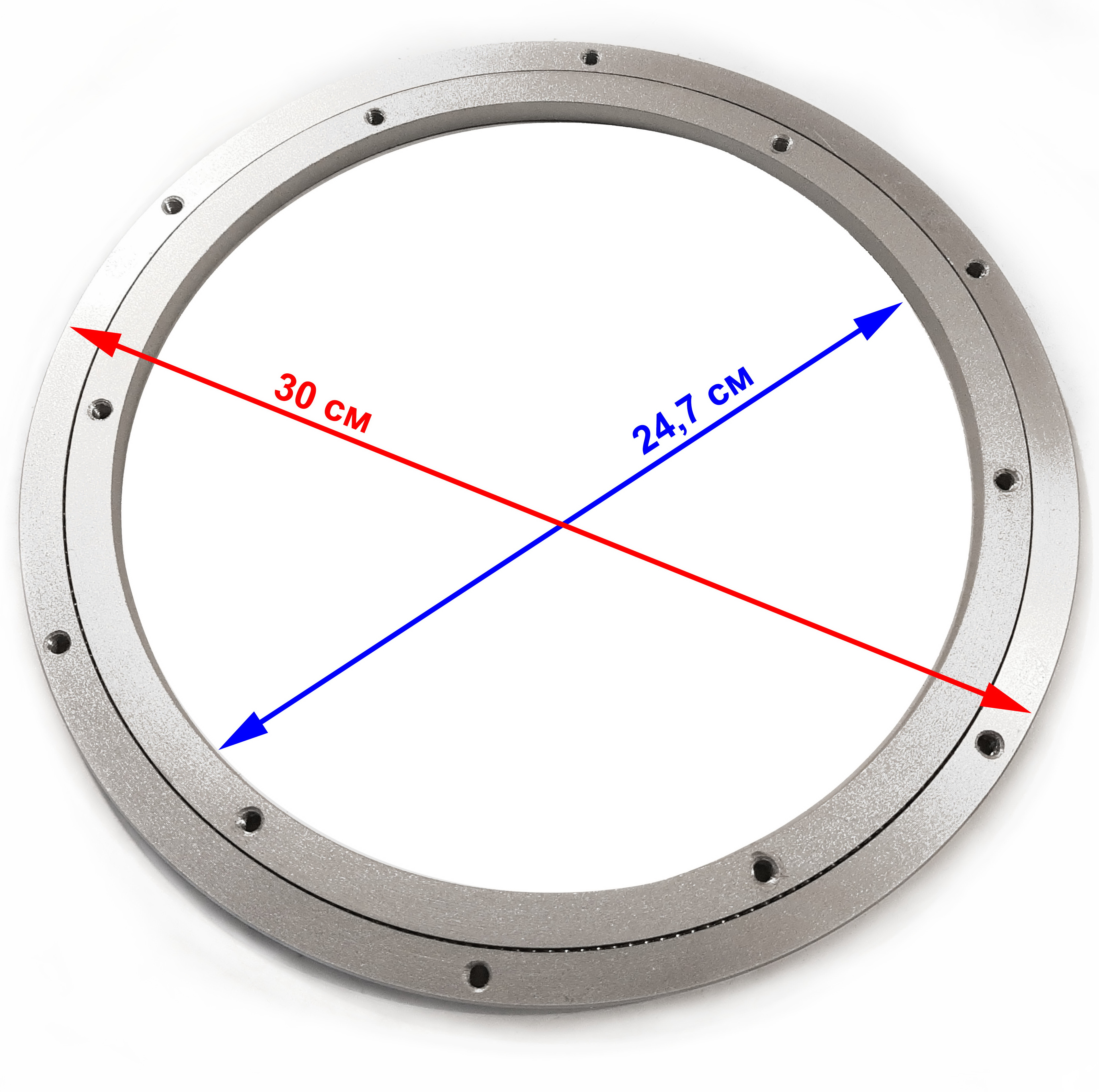 Поворотный механизм (кольцевой подшипник диаметром 30 см) с отверстиями под винты/саморезы + крепеж к нему. Подходит для поворотного круга диаметром от 40 см до 80 см. Отверстия имеют резьбу М6, а также зенковки под головки саморезов или винтов М4/М5. Предусмотрено несколько вариантов монтажа.