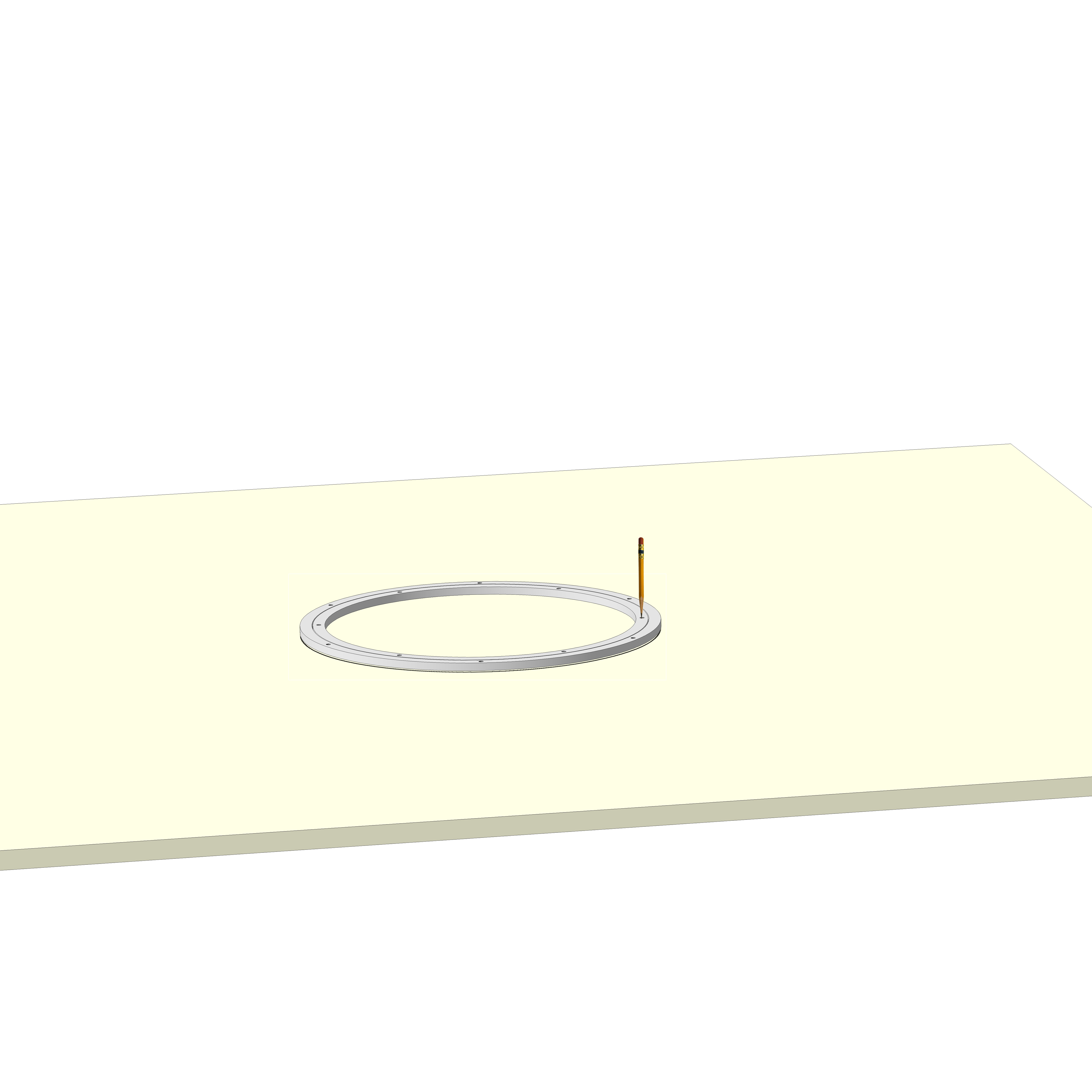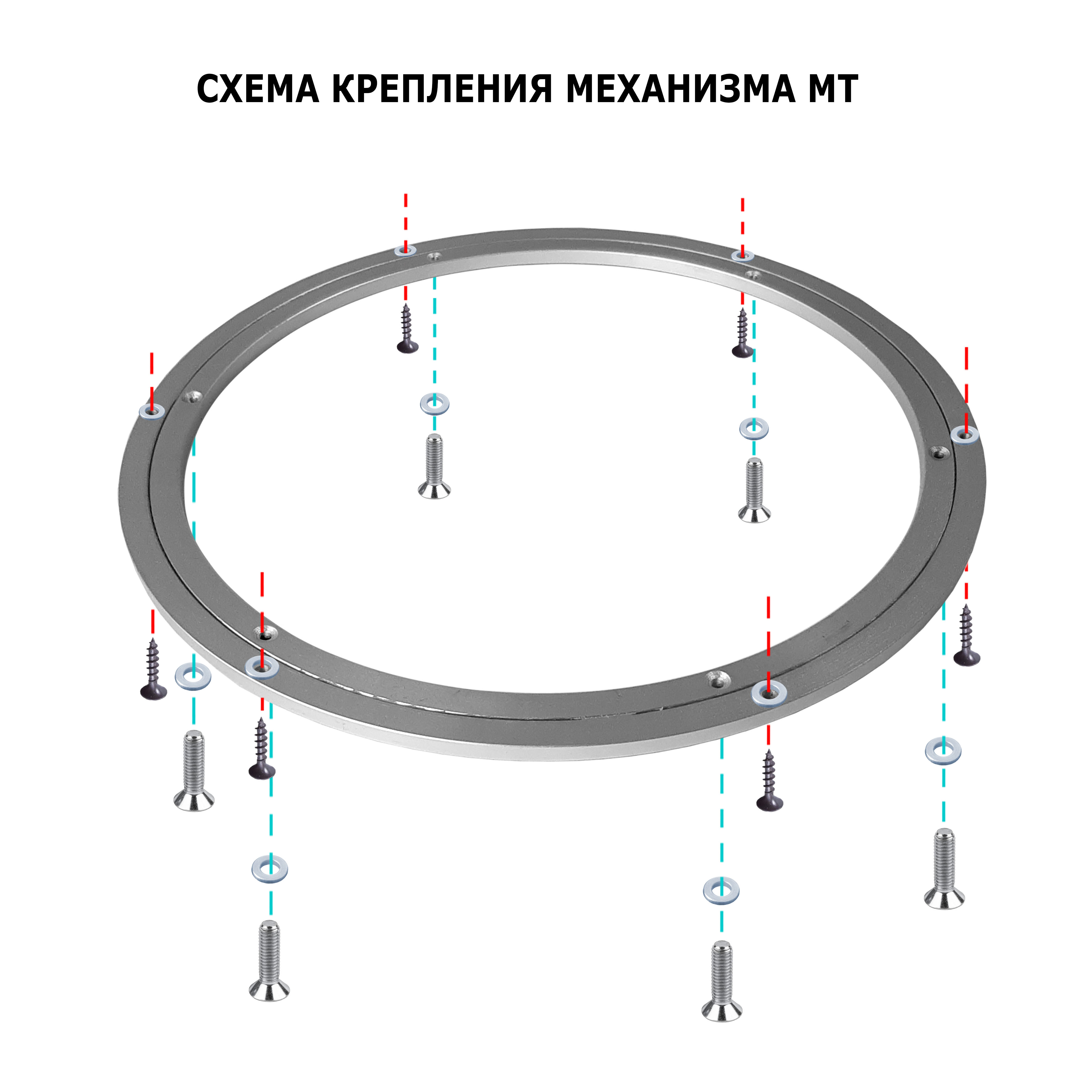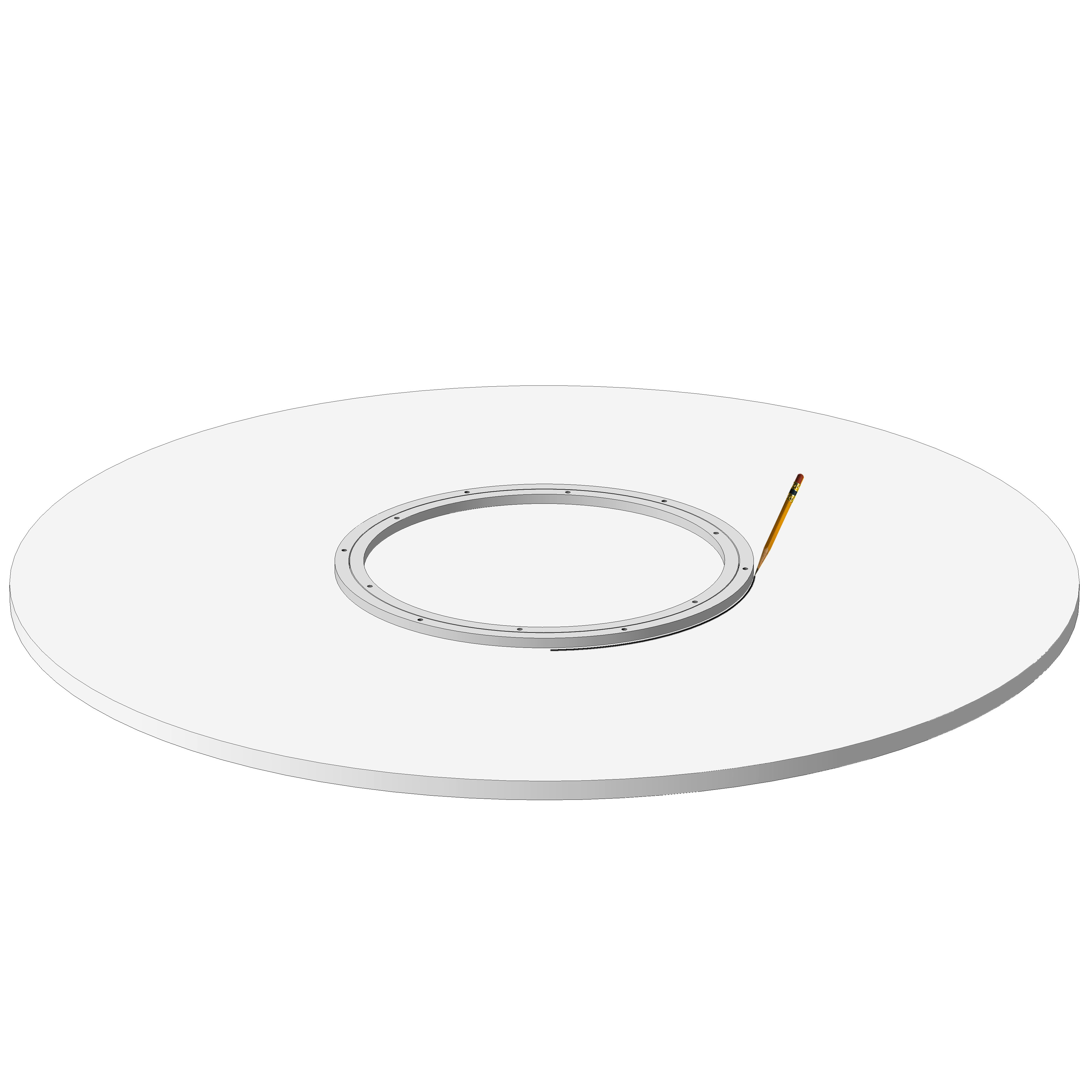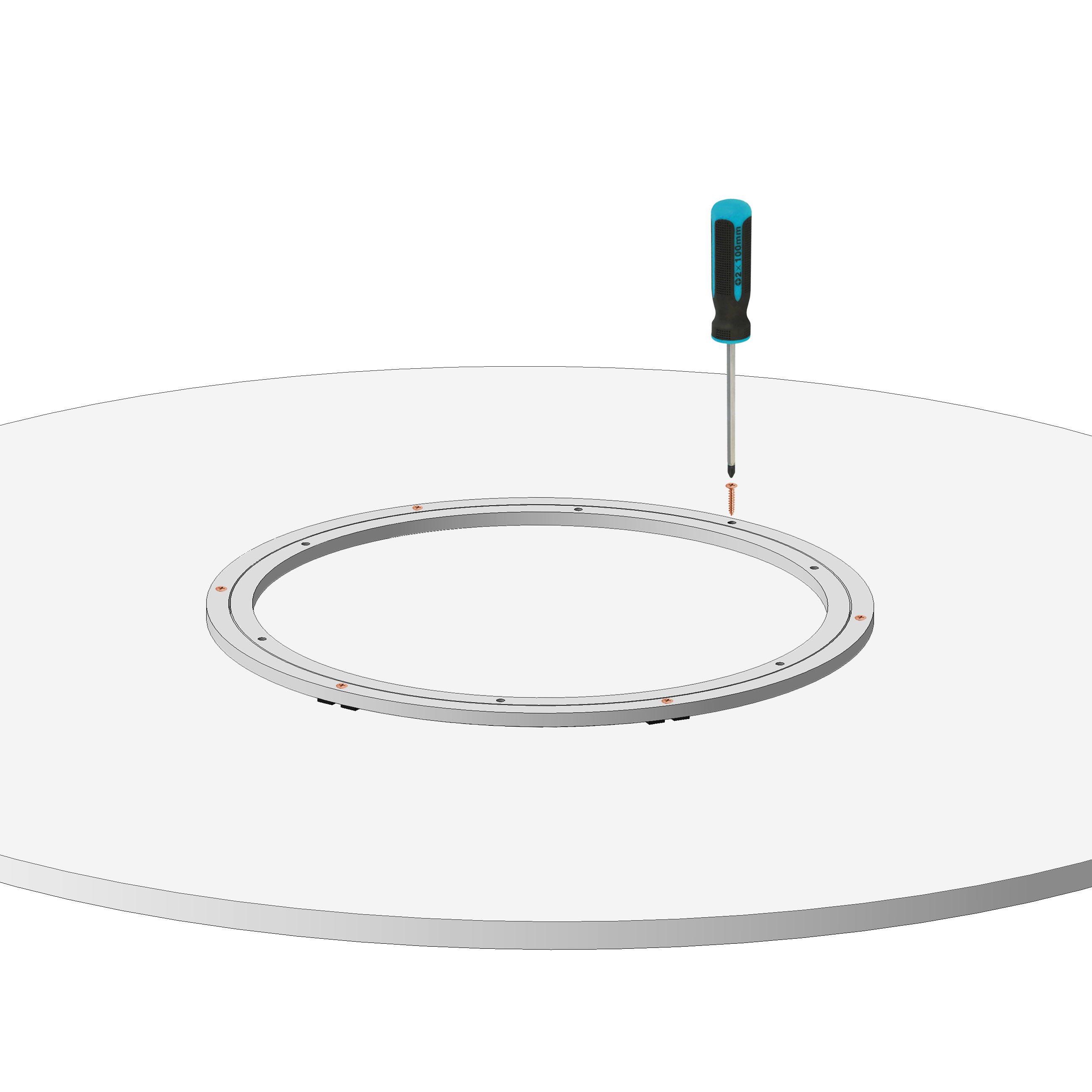 Поворотный механизм (кольцевой подшипник диаметром 30 см) с отверстиями под винты/саморезы + крепеж к нему. Подходит для поворотного круга диаметром от 40 см до 80 см. Отверстия имеют резьбу М6, а также зенковки под головки саморезов или винтов М4/М5. Предусмотрено несколько вариантов монтажа.