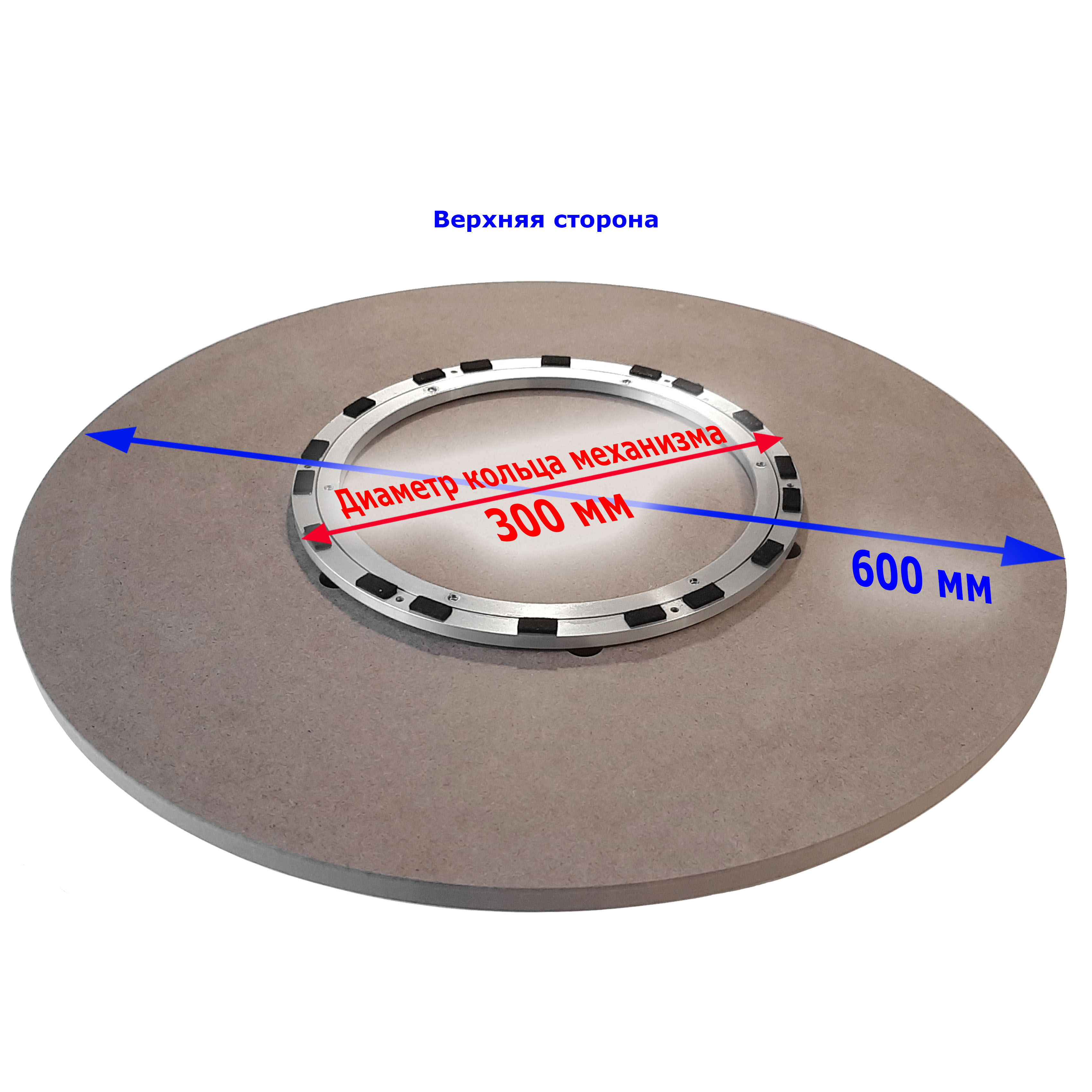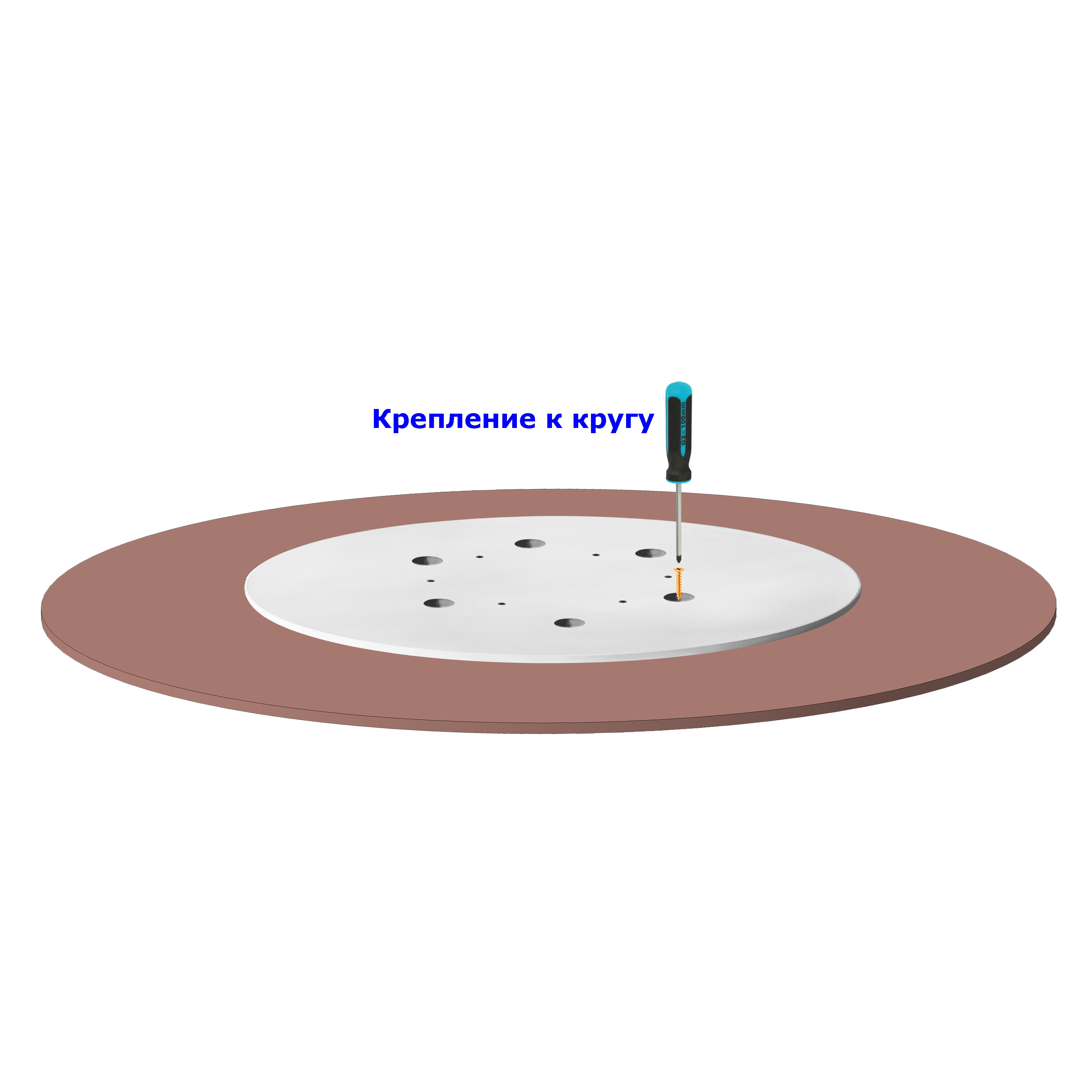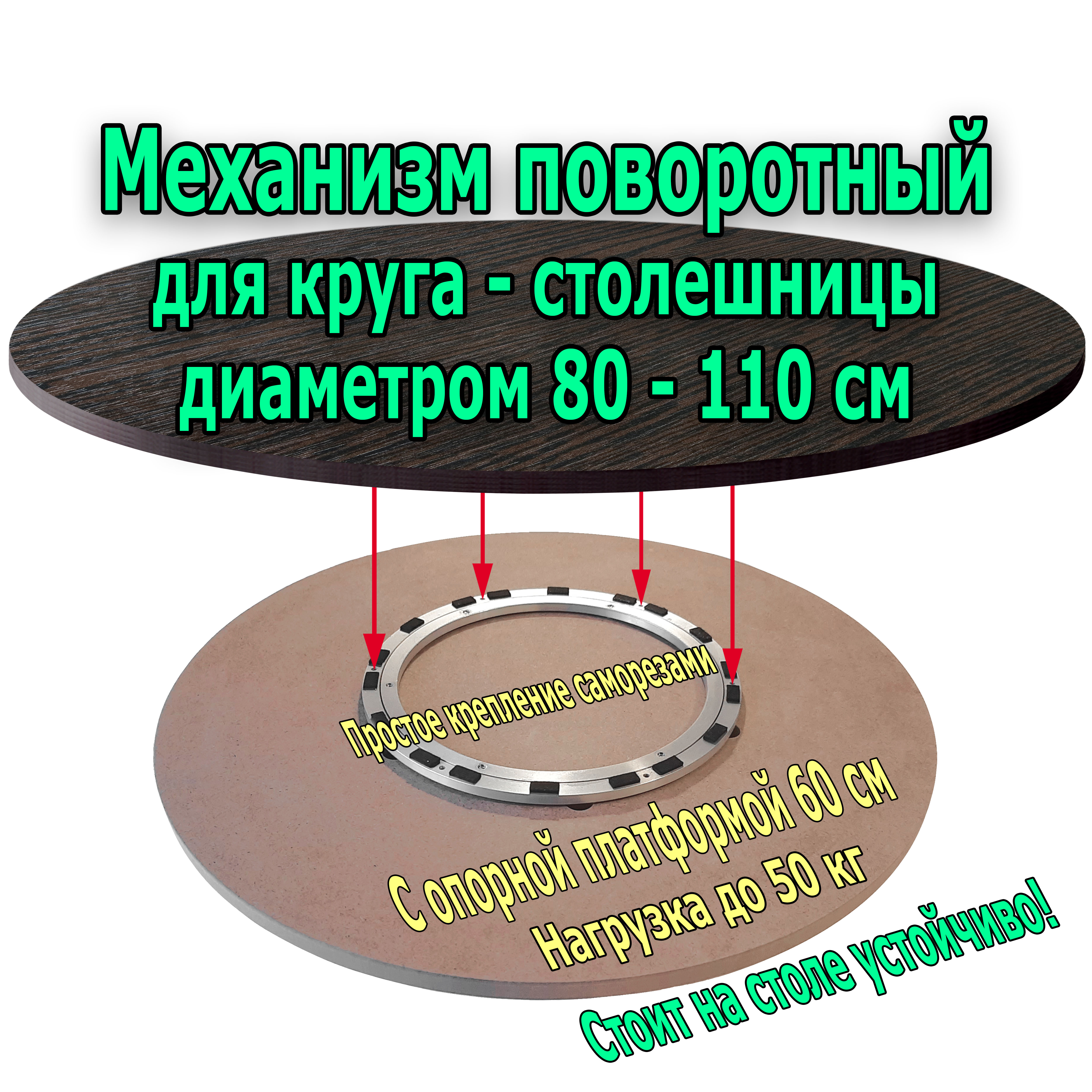 Поворотный механизм на опорной площадке диаметром 60 см для крепления вращающегося круга-столешницы диаметром от 80 см до 110 см. Столешница может быть толщиной от 16 до 40 мм. Механизм D30 см с опорной площадкой обеспечивает даже лучшую устойчивость, чем более дорогие механизмы большого диаметра без площадки! На внешнем кольце механизма предусмотрены 6 отверстий с зенковками под саморезы. В площадке есть сквозные отверстия под отвертку. Сборка не требует усилий, нужна только отвертка.