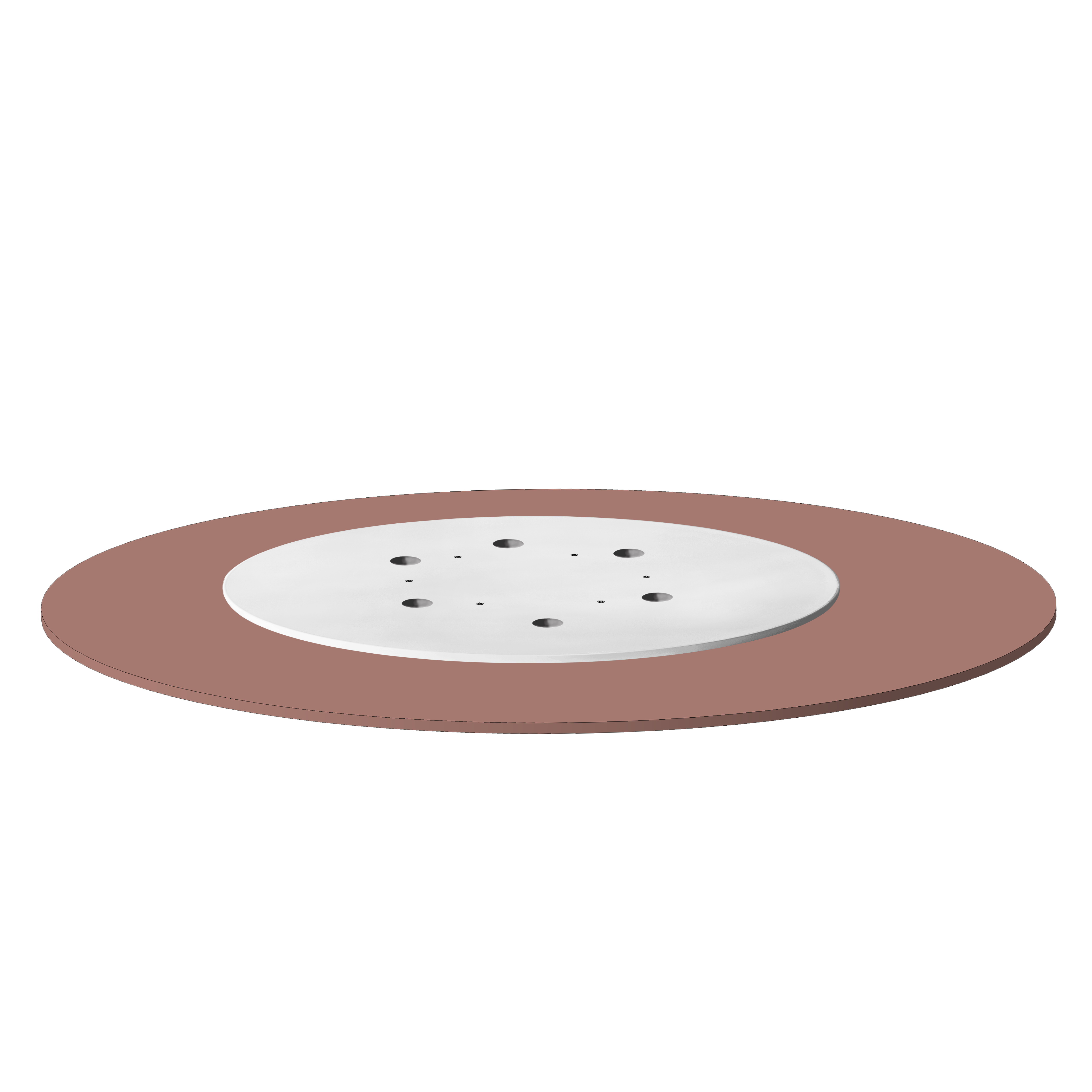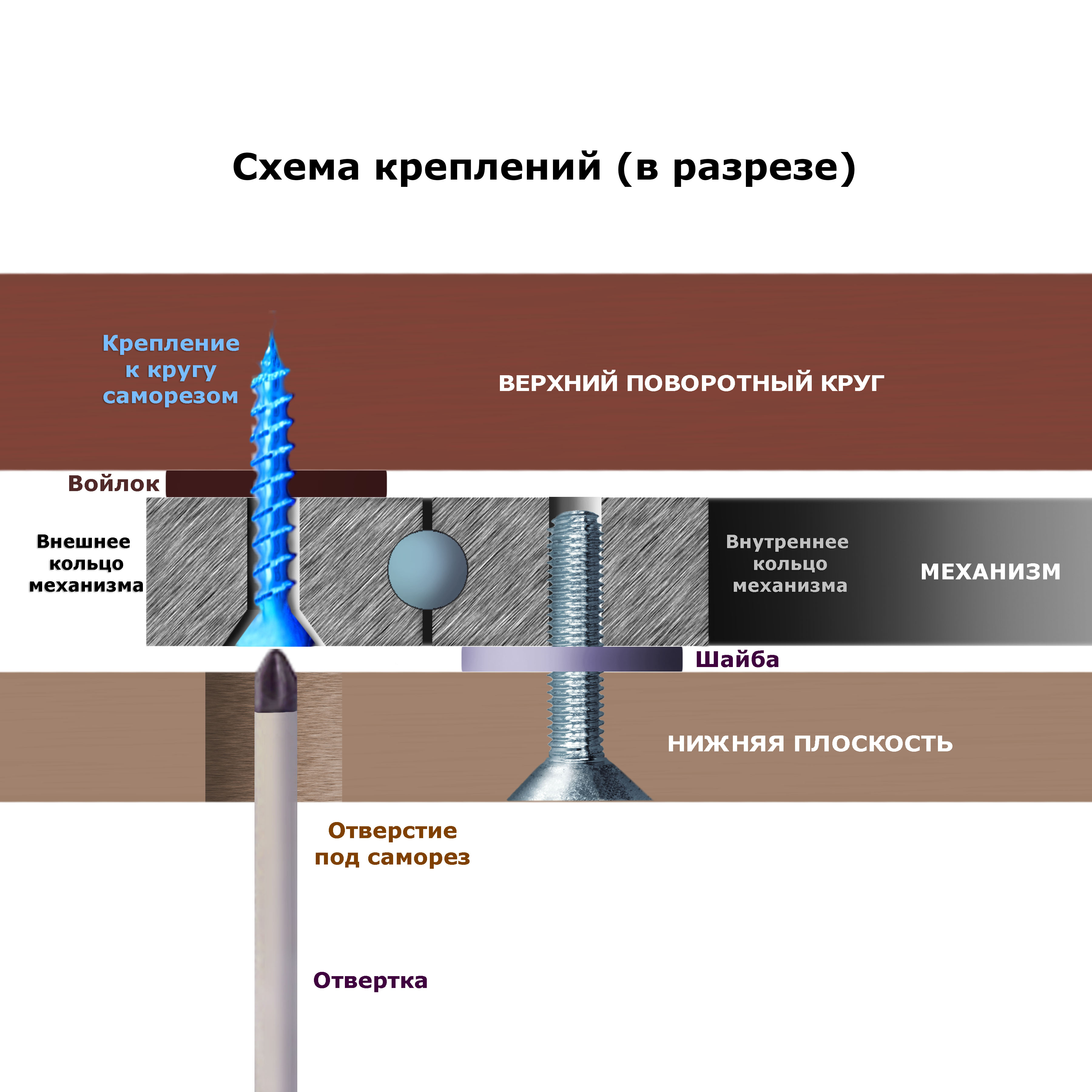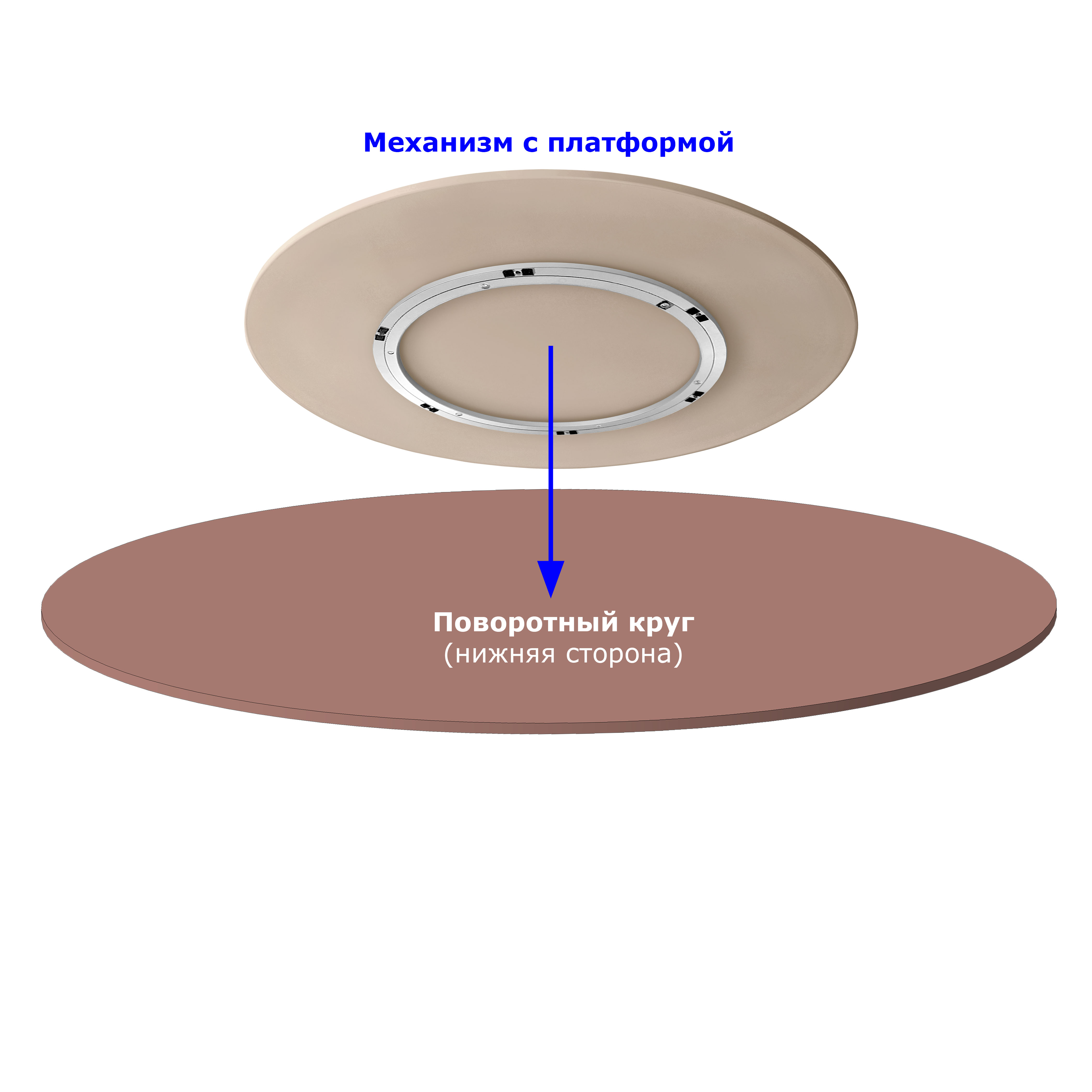 Поворотный механизм на опорной площадке диаметром 60 см для крепления вращающегося круга-столешницы диаметром от 80 см до 110 см. Столешница может быть толщиной от 16 до 40 мм. Механизм D30 см с опорной площадкой обеспечивает даже лучшую устойчивость, чем более дорогие механизмы большого диаметра без площадки! На внешнем кольце механизма предусмотрены 6 отверстий с зенковками под саморезы. В площадке есть сквозные отверстия под отвертку. Сборка не требует усилий, нужна только отвертка.