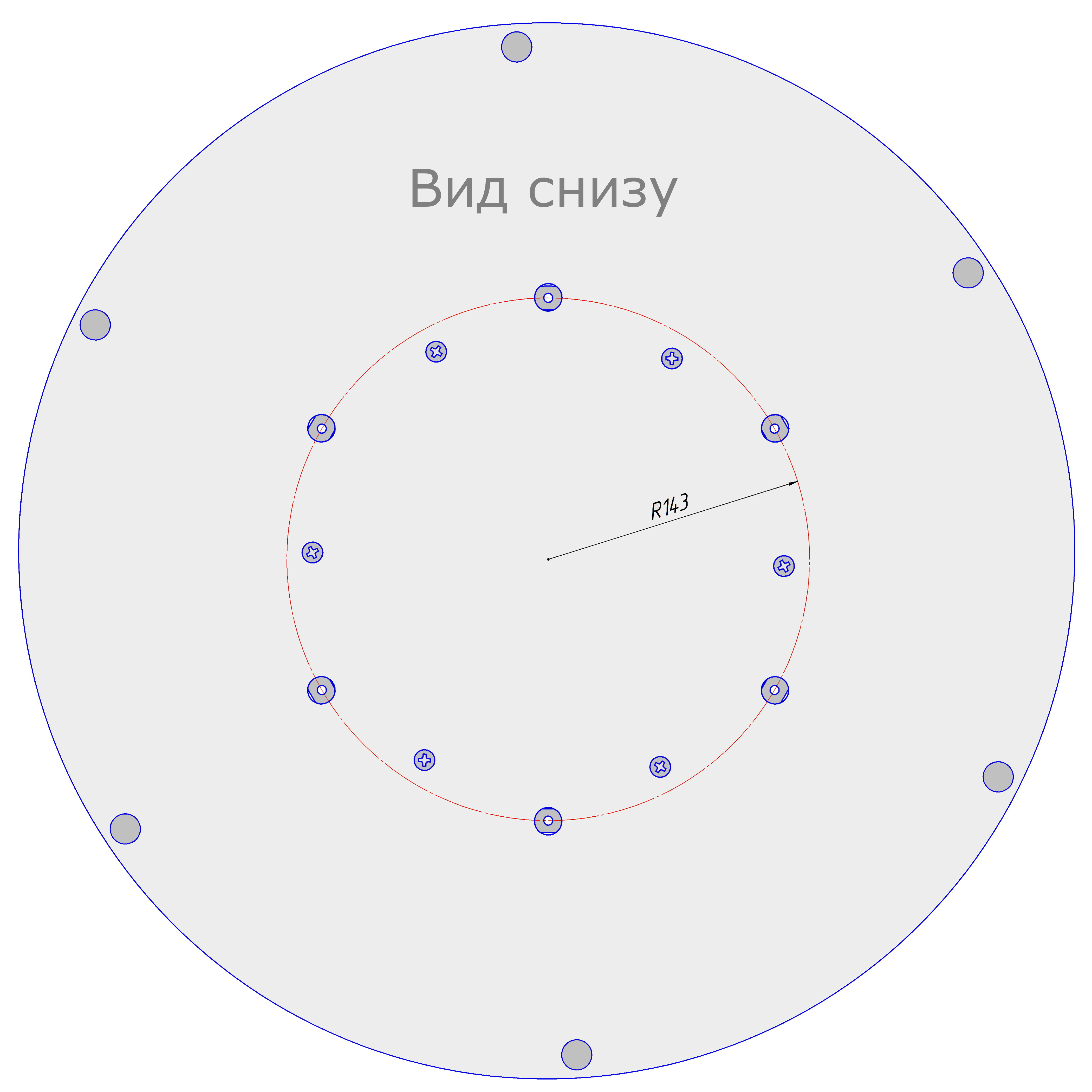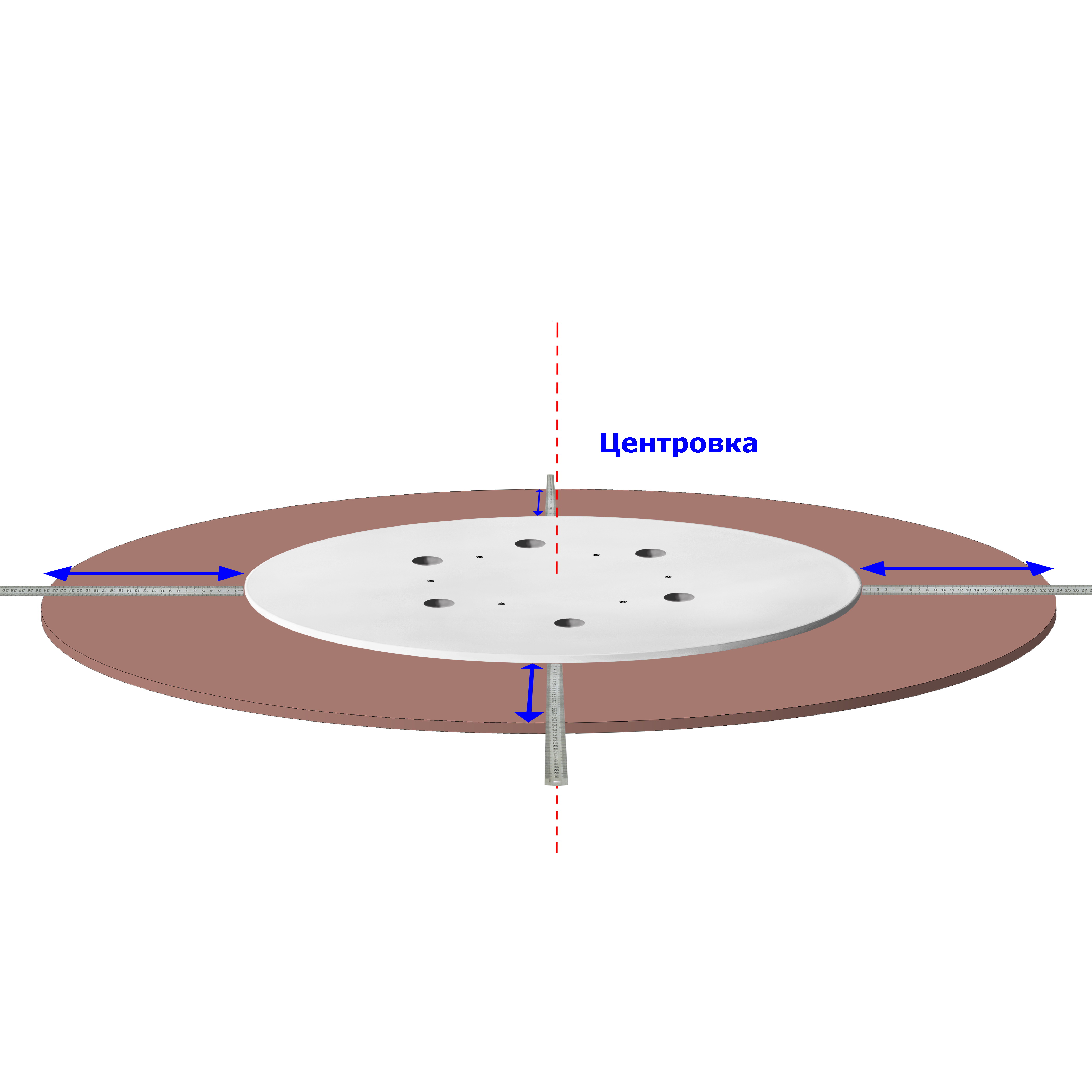 Удобно делать центровку механизма на поворотном круге с помощью длинной линейки или рулетки. Достаточно добиться одинакового расстояния от края опорной площадки до краев поворотного круга с разных сторон. Если вы хотите заранее наметить точки крепления саморезов, будет 6 точек по радиусу 143 мм от центра вращения (везде угол 60 град). Останется ввернуть саморезы сквозь отверстия в опорной площадке. Чтобы саморезы держались на отвертке, лучше использовать отвертку с магнитным наконечником, но можно просто нанести на головки саморезов пластилин. Собранный крутящийся центр ставится на стол, крепить к столу не требуется.