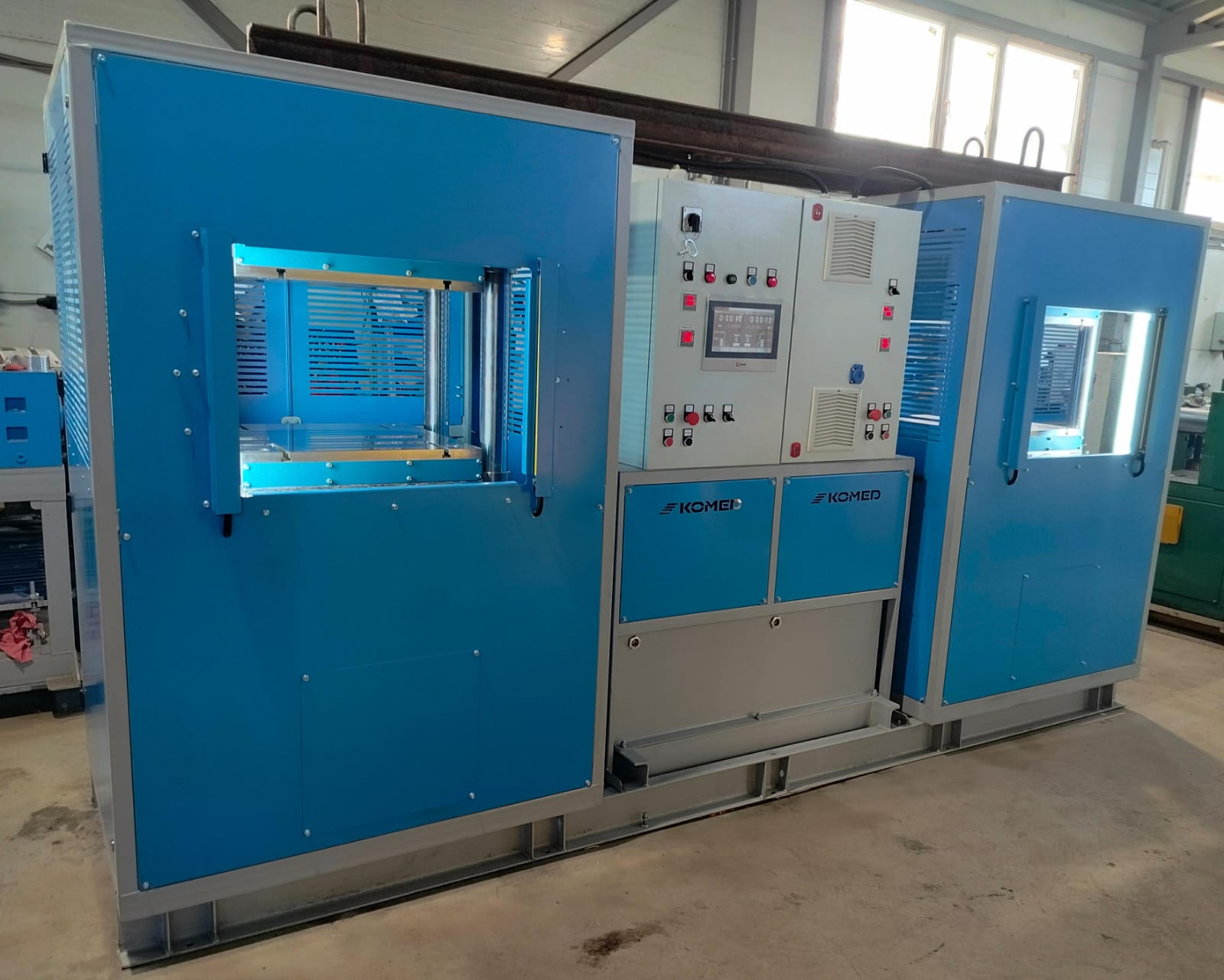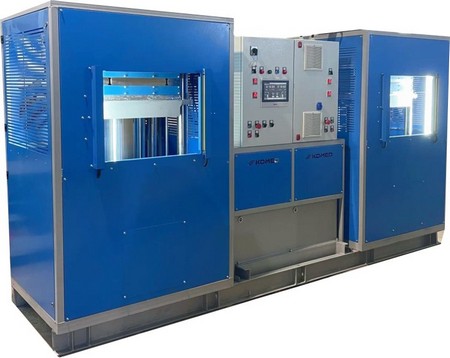 Пульт управления позволяет настроить и записать параметры из технологического регламента, а именно: усилие прессования, время вулканизации, количество подпрессовок, счетчик выполненных отпрессовок, настройка таймера на включение/выключение нагрева плит по времени и дням недели.