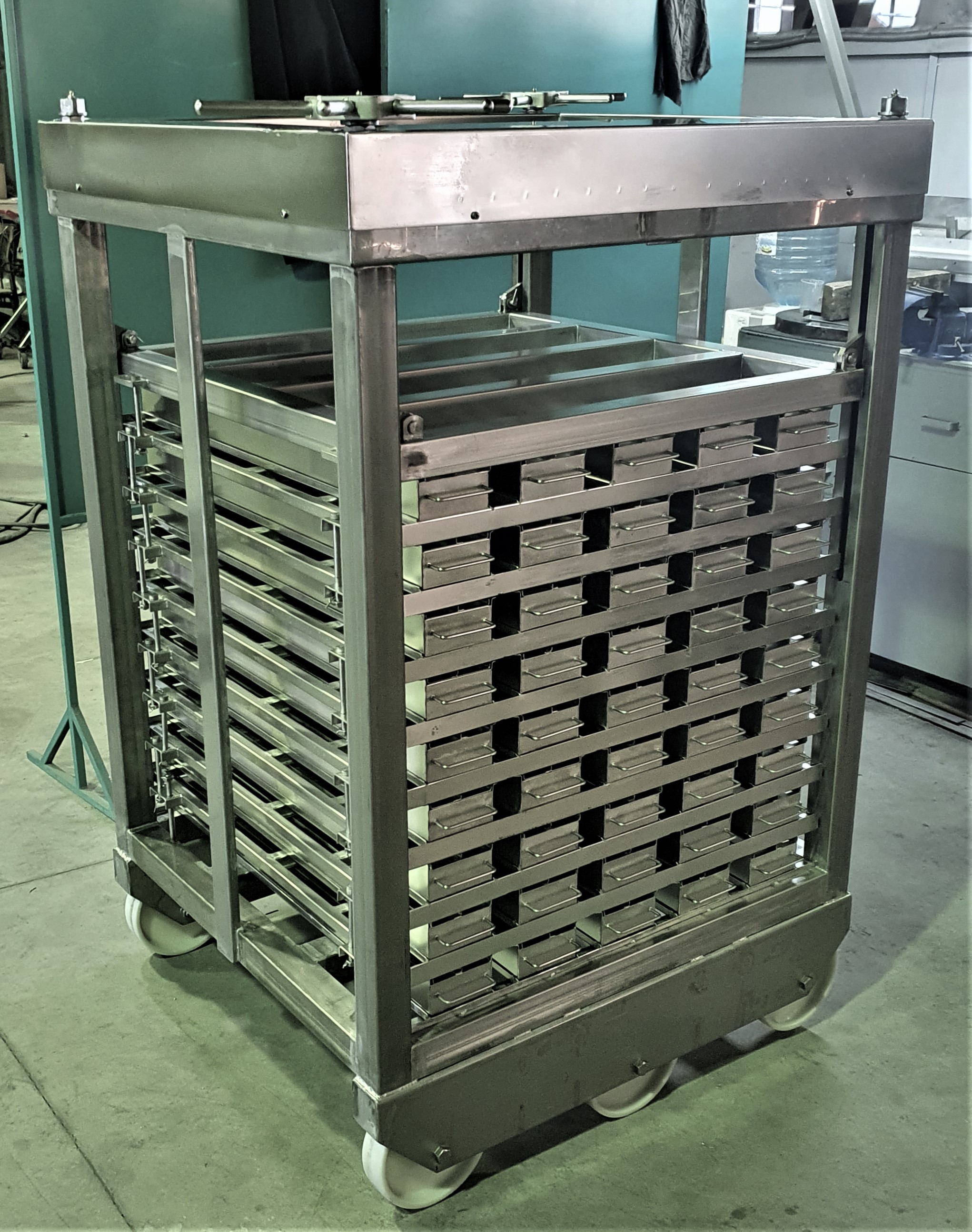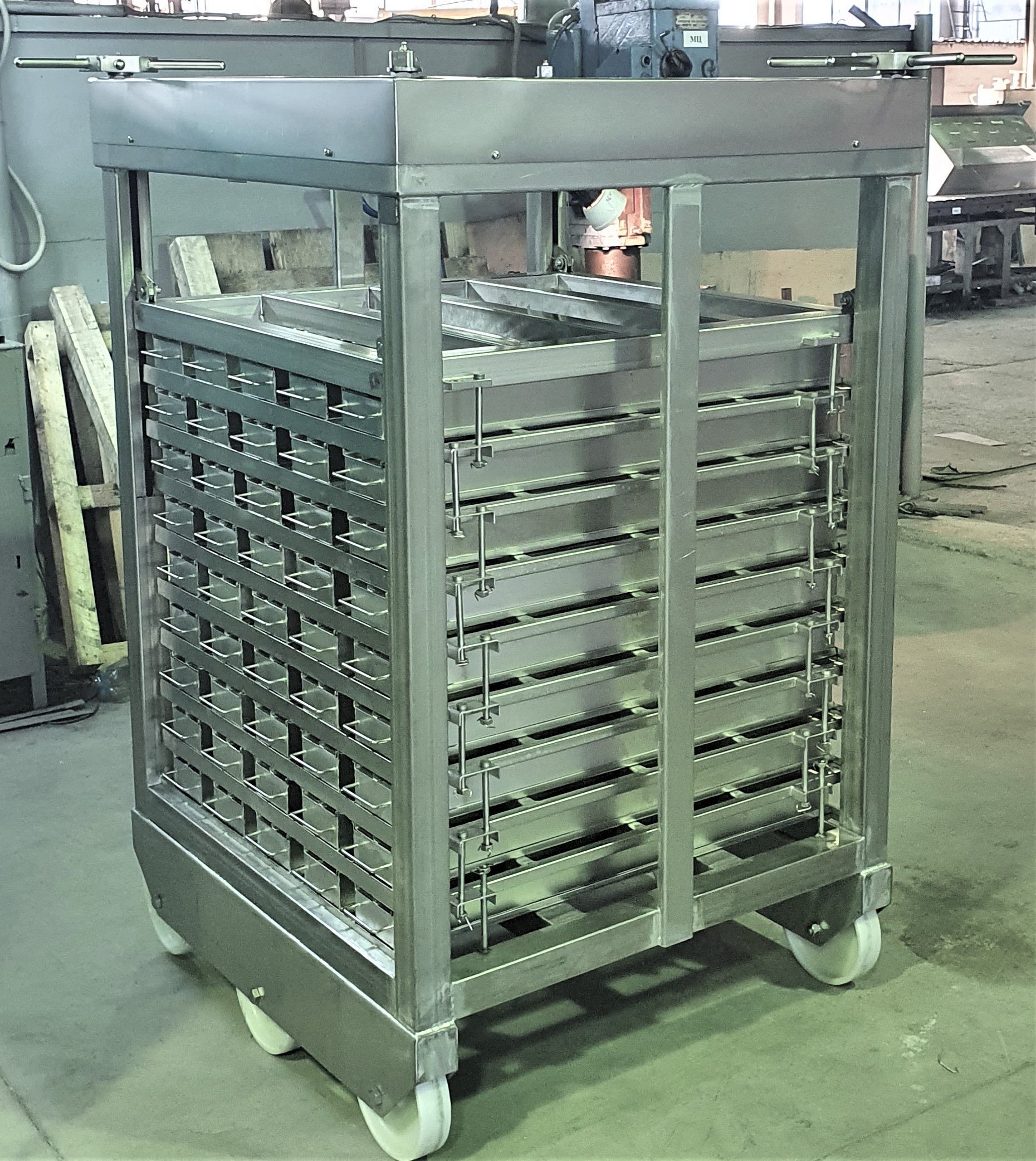 Пресс-рама имеет стандартные размеры 1000х1000 мм и подходит практически для всех термокамер. Пресс-рама для варки ветчины комплектуется пресс-формами, которые могут быть прямоугольной или полукруглой формы. Каждая пресс-форма по длине может быть разделена на несколько ячеек.