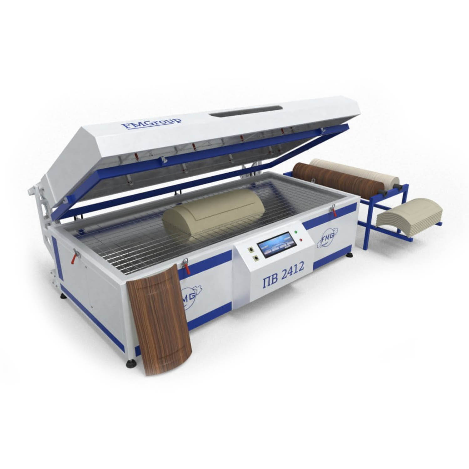 Пресс вакуумный серии FMGroup ПВ в зависимости от комплектации имеют в оснащении один, два или три рабочих стола. В комплектации ПВК один рабочий стол, ПВО –один рабочий стол и промежуточную базу (каркас, на котором располагается нагревательная каретка в промежутках между циклами прессования). В комплектации ПВО-2 пресс имеет два рабочих стола, один из них может быть подъемным «Драпирующим», а второй стандартный – плоский и промежуточную базу (по желанию клиента).