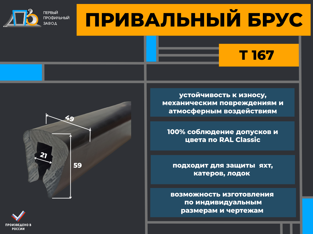Размеры привального бруса Т 167 подобраны таким образом, чтобы обеспечить оптимальное сочетание прочности, веса и гибкости. Его высота 58.8 мм и ширина 47 мм позволяют ему выполнять свои функции, не утяжеляя судно и не создавая лишнего сопротивления при движении.