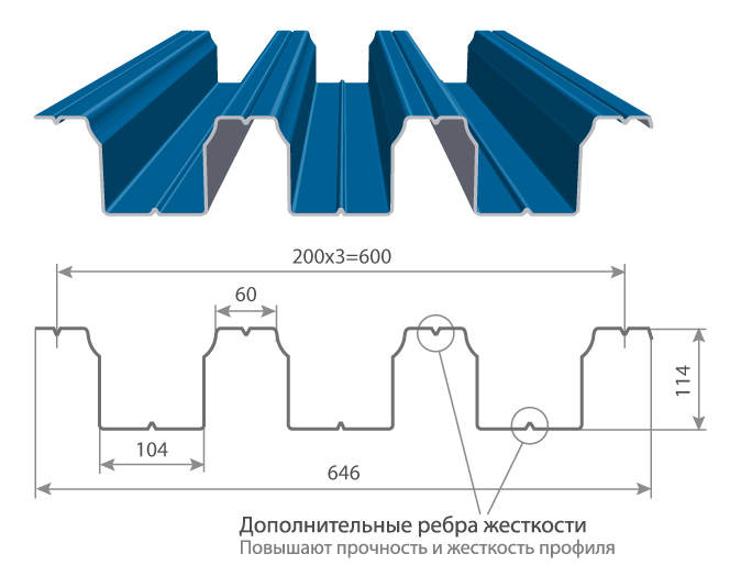 - Самый прочный и жесткий профиль, имеет высокий гофр (114 мм), с дополнительными ребрами.