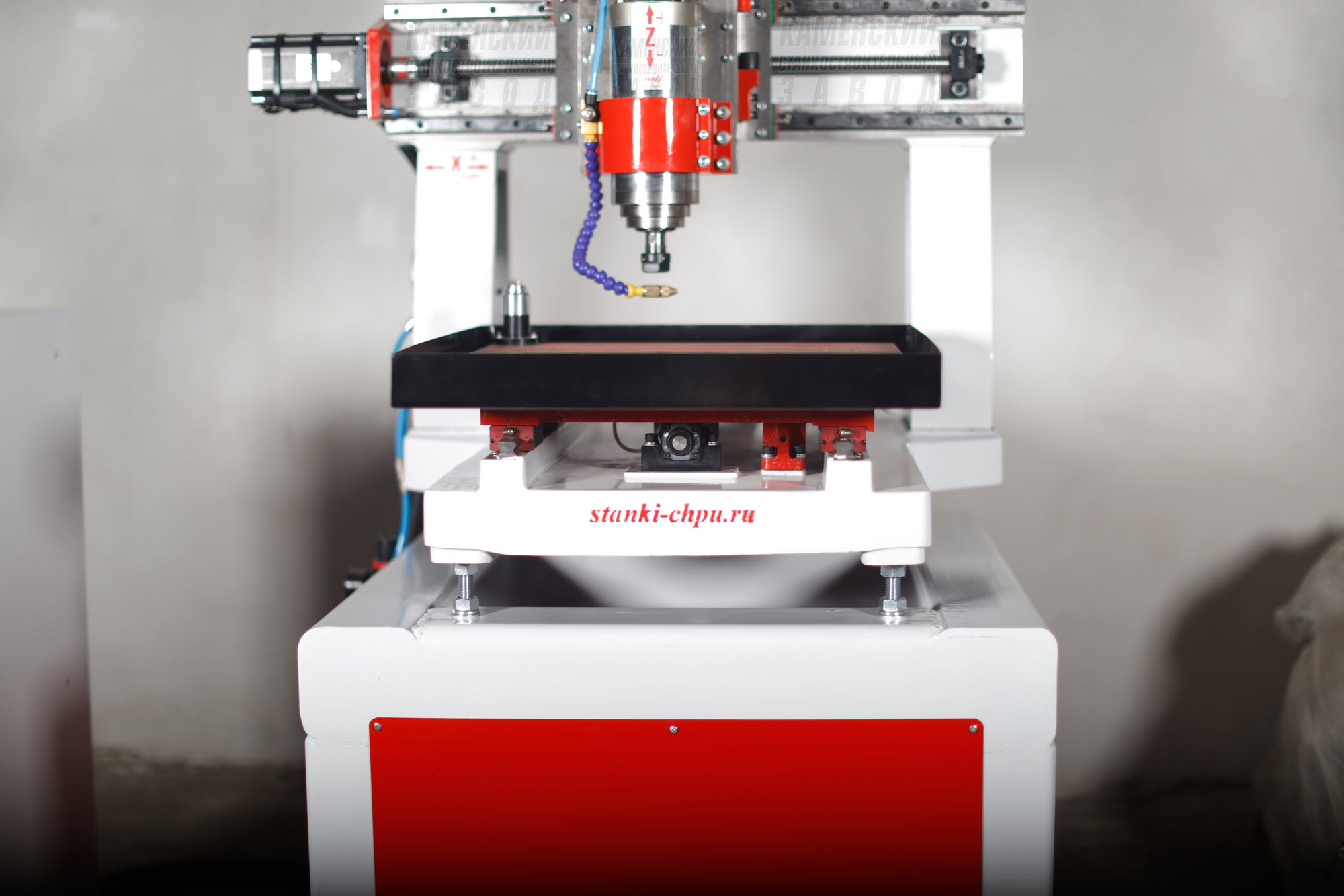 На станке установлен стальной стол с Т-образными пазами! Он более надежен и лучше по своим характеристикам, чем пазовый алюминиевый стол. Также в конструкции стола имеется ванна для сбора СОЖ, необходимая при обработке металла или камня.