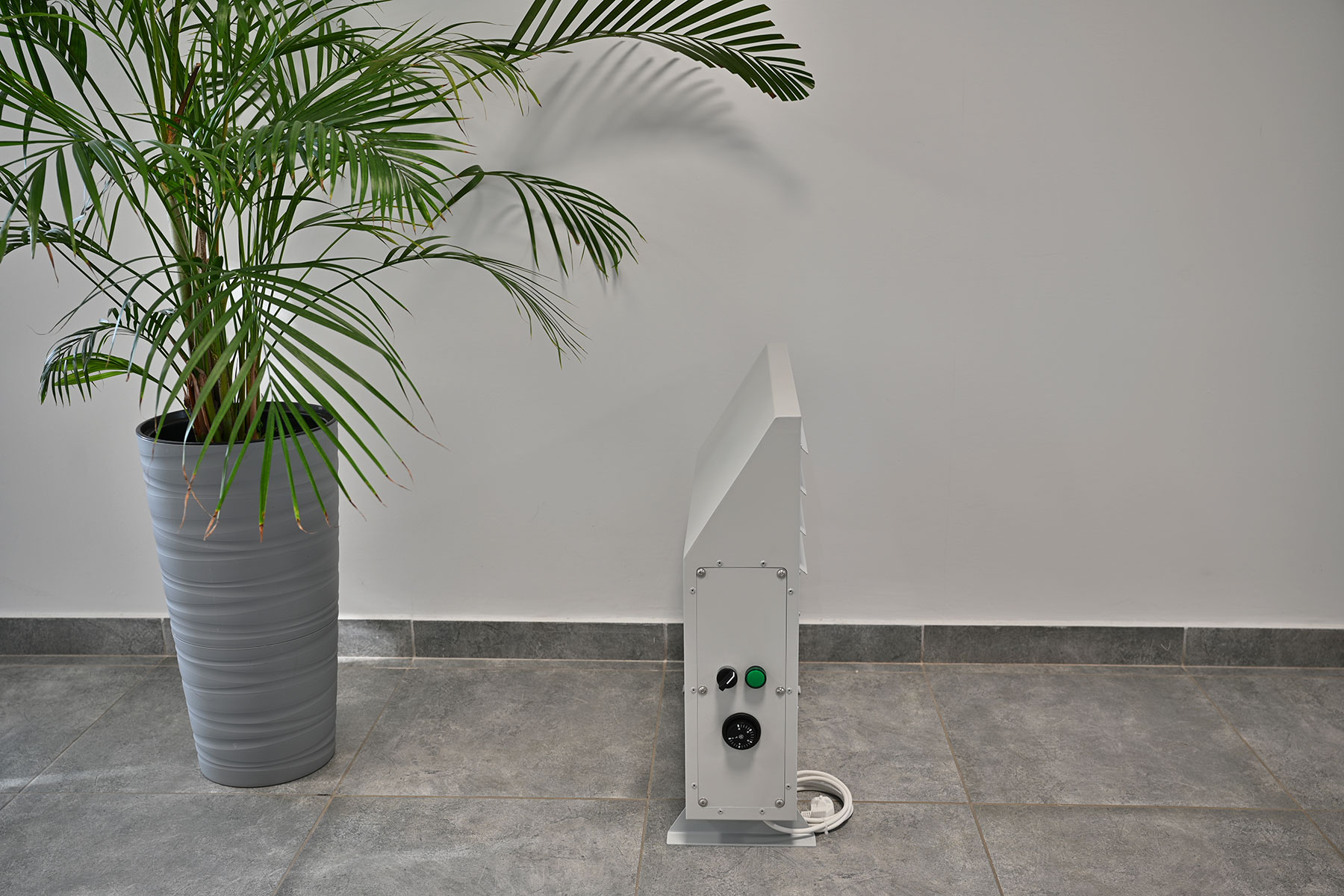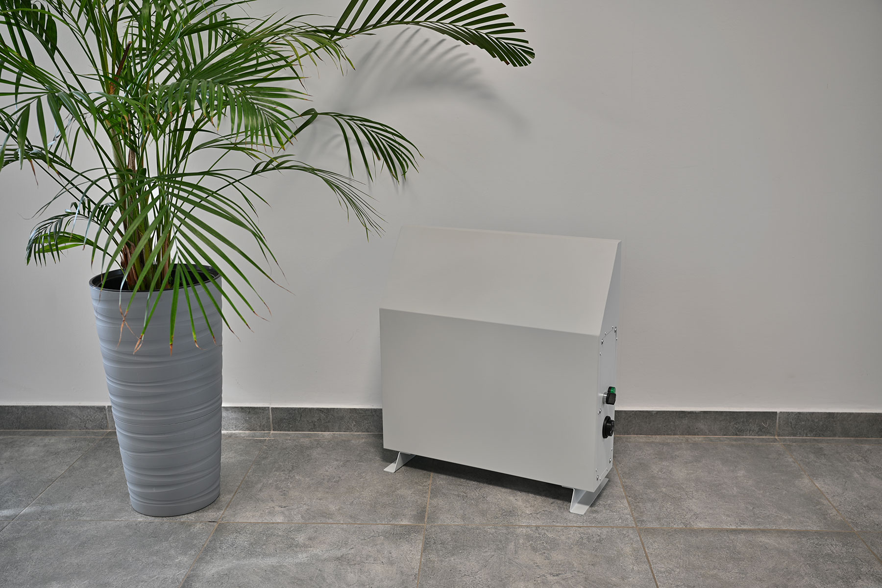 Дополнительно каждый конвектор оснащён терморегулятором оболочки, предотвращающим перегрев корпуса. Диапазон регулировки составляет от 0 до +90 °С. По умолчанию установлено ограничение +60 °С, что соответствует требованиям безопасности. Для изменения этого значения требуется доступ через боковую панель (операция недоступна для рядового пользователя). Повышение температуры поверхности допускается только при условии установки дополнительных защитных экранов или ограждений, поскольку при касании возможны ожоги. Такой режим может быть полезен, если требуется ускоренный нагрев помещения.