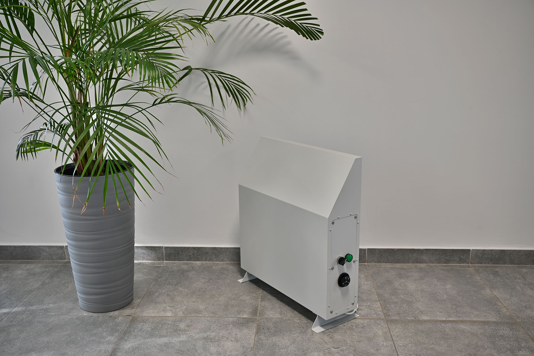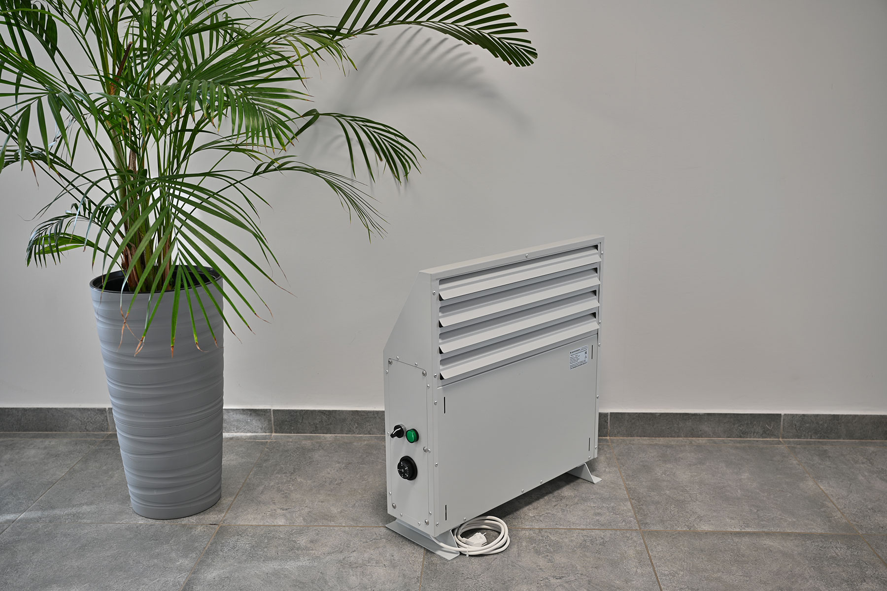 Конвектор состоит из прочного стального корпуса с полимерным покрытием RAL 7035, устойчивым к коррозии и механическим повреждениям. Внутри корпуса расположен нагревательный элемент с увеличенной поверхностью теплообмена, обеспечивающий высокую эффективность передачи тепла.