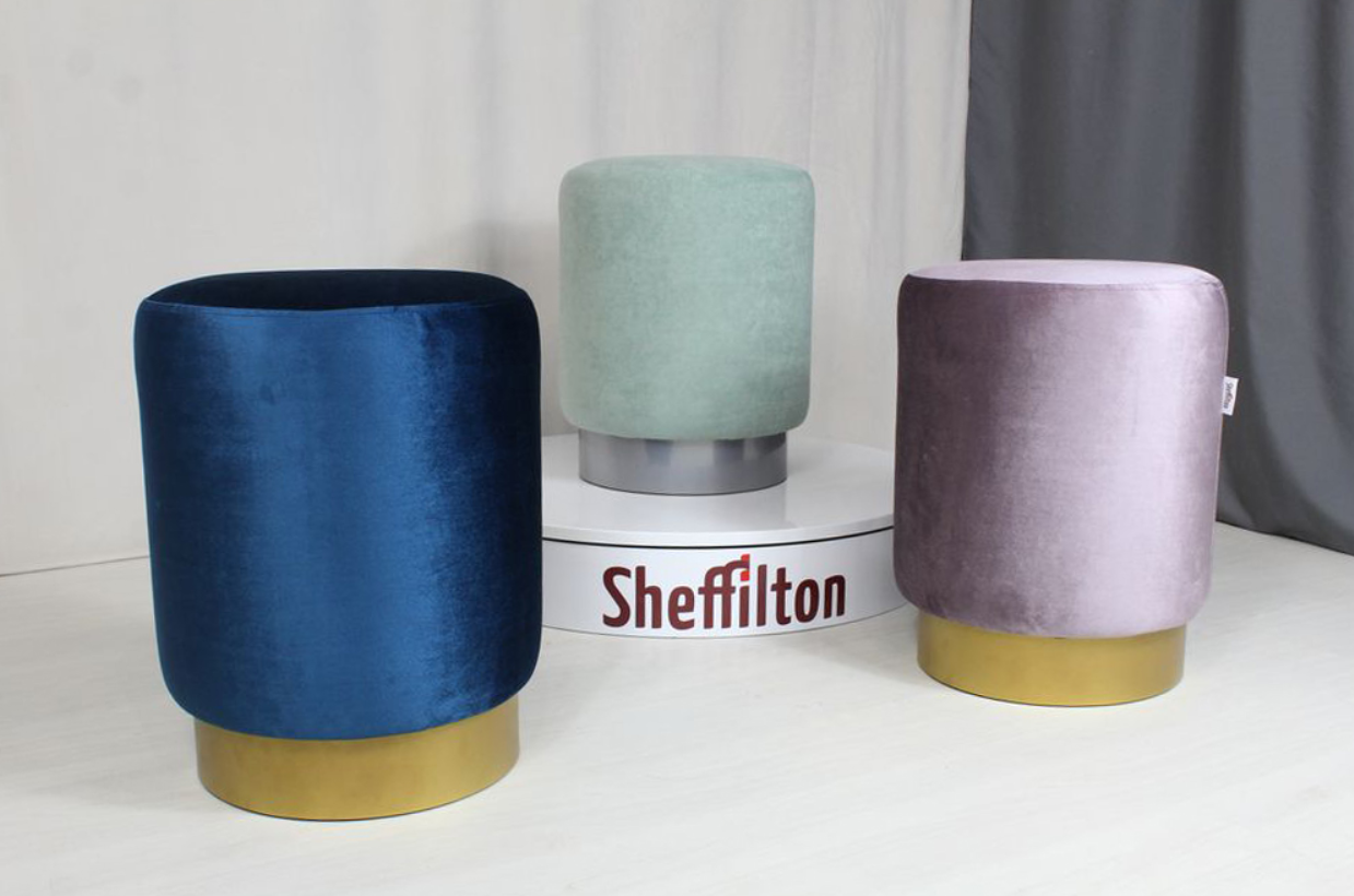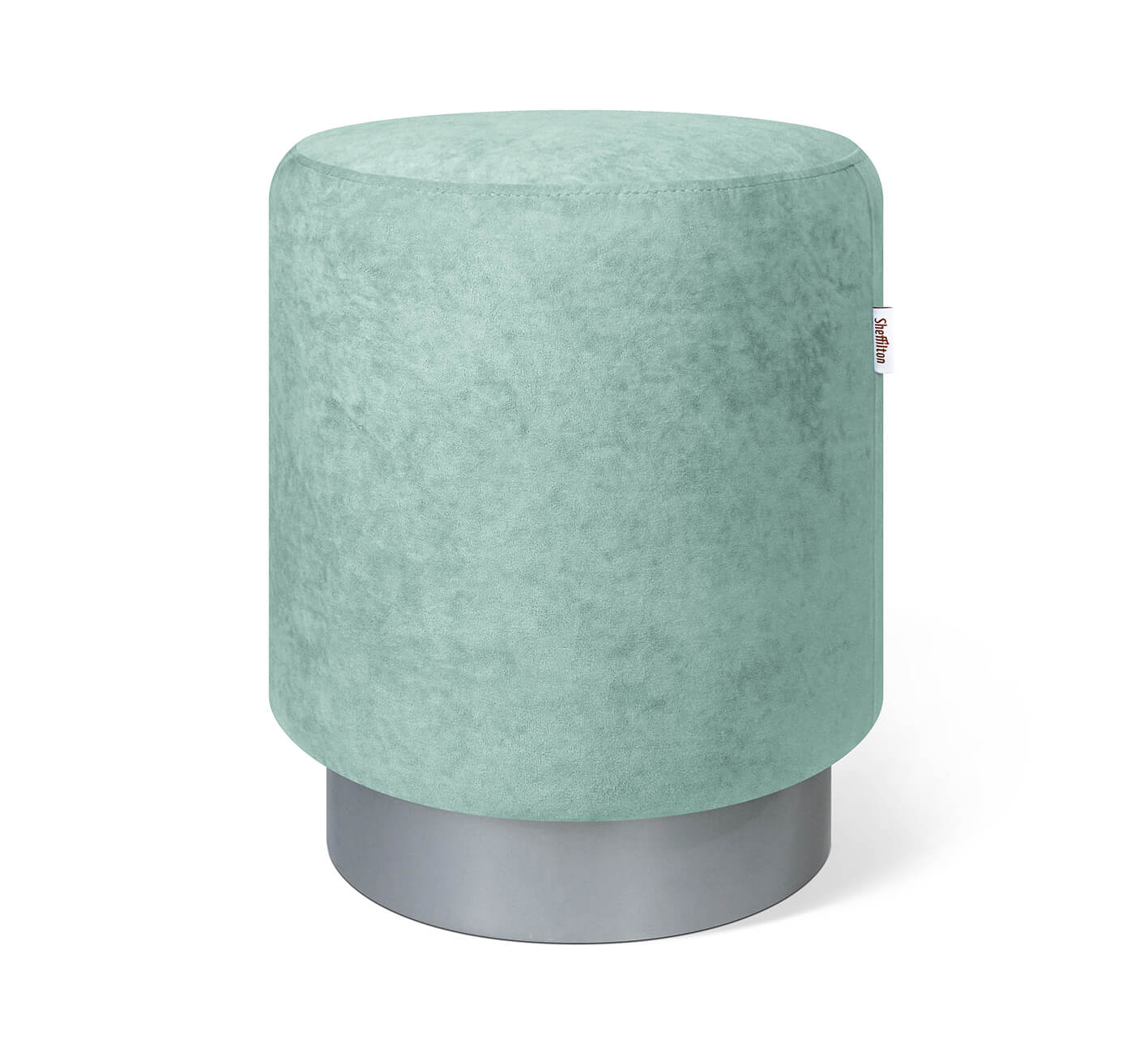 Нежный пуф цилиндрической формы в нижней части окантован серебряным металлическим кольцом более узкого диаметра. Надежность металла и мягкость ткани прекрасно сочетаются в готовом исполнении пуфа.
