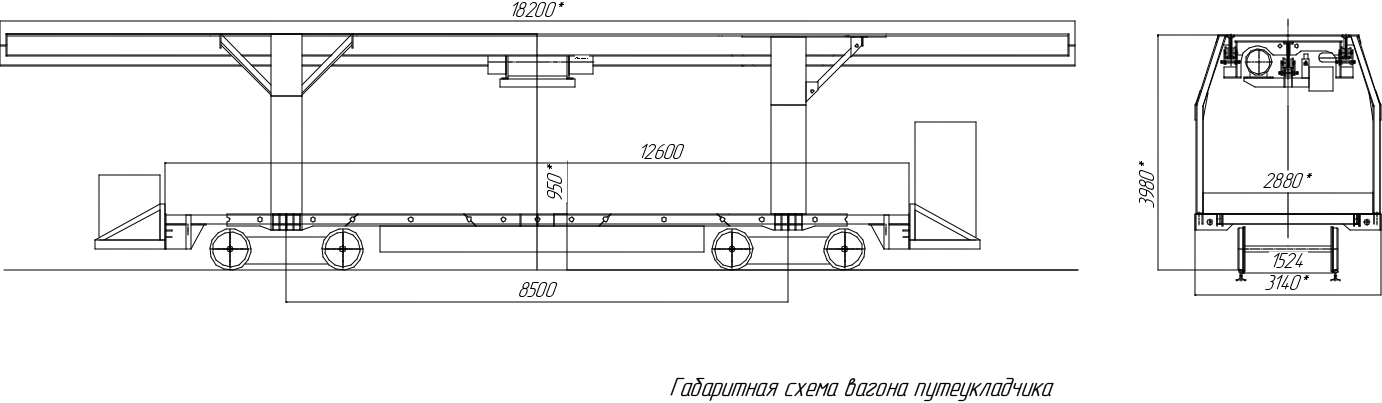 Максимальная высота по металлоконструкции - не более 4000мм. Внутренняя ширина между стойками не менее 2880мм. Максимальная ширина до высоты 2800мм - не более 3150мм. Ширина верхней части на высоте 4000мм не более 2200мм. Максимальная длинна грузовой части платформы не менее 12500мм. Максимальная длинна по верхней части в транспортном положении не более 18200мм. По верхней части точки крепления диэлектрических защитных приспособлений, исключающие замыкание металлоконструкций путеукладчика на контактную сеть. Предусмотрены точки крепления стандартной трамвайной сцепной системы для работы по СМЕ и дополнительных сцепок с обеих торцов платформы. Подготовка для установки 4-х гидравлических упоров предотвращающие опрокидывание во время укладки и погрузки плетей, подкладки для упоров в комплекте. Выдвижная часть грузоподъёмной системы самоходная и снабжена фиксатором в рабочих и транспортном положениях. Предусмотрены точки крепления приспособлений для надежной фиксации плетей во время транспортировки. Сплошной металлический настил платформы.