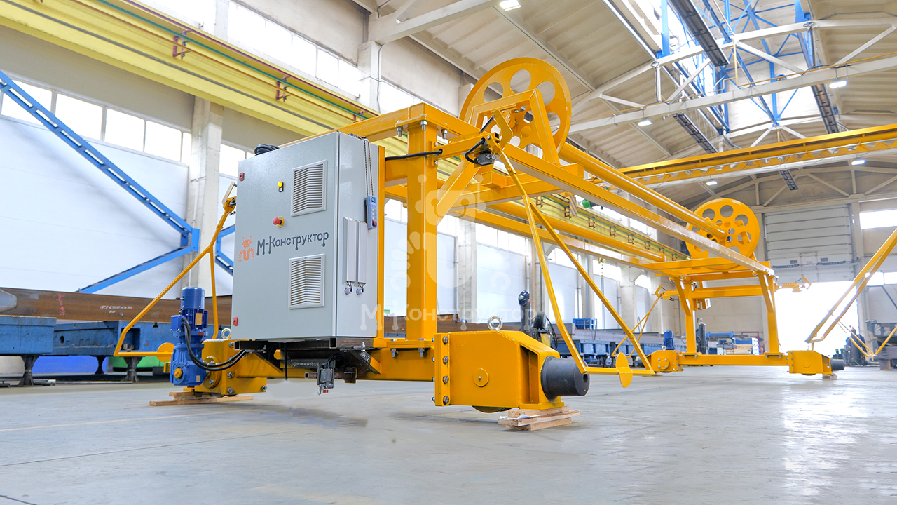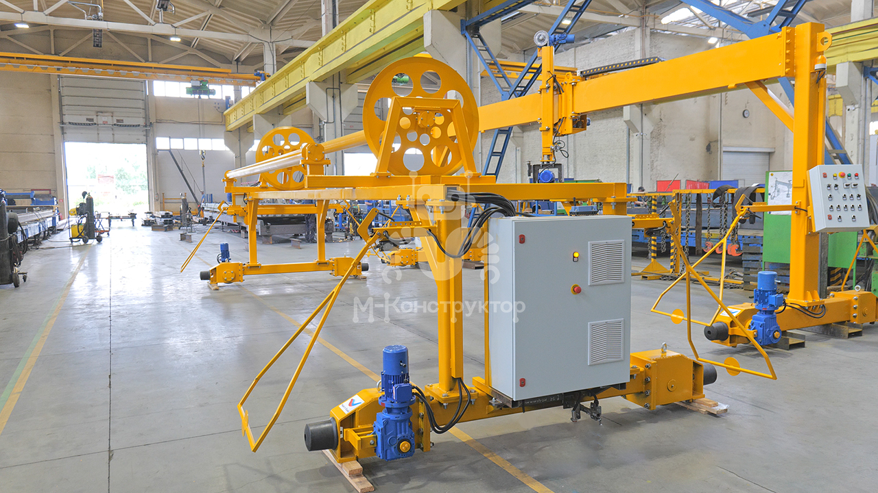 Размотчик перемещается по рельсам вдоль линии, разматывая полотно с барабана