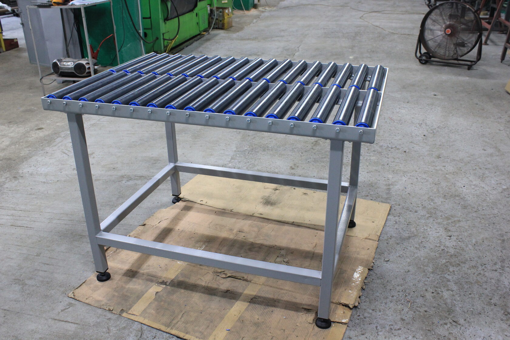 - Ряд параллельных роликов с синими торцевыми элементами — основной рабочий механизм. Ролики свободно вращаются, облегчая перемещение грузов.