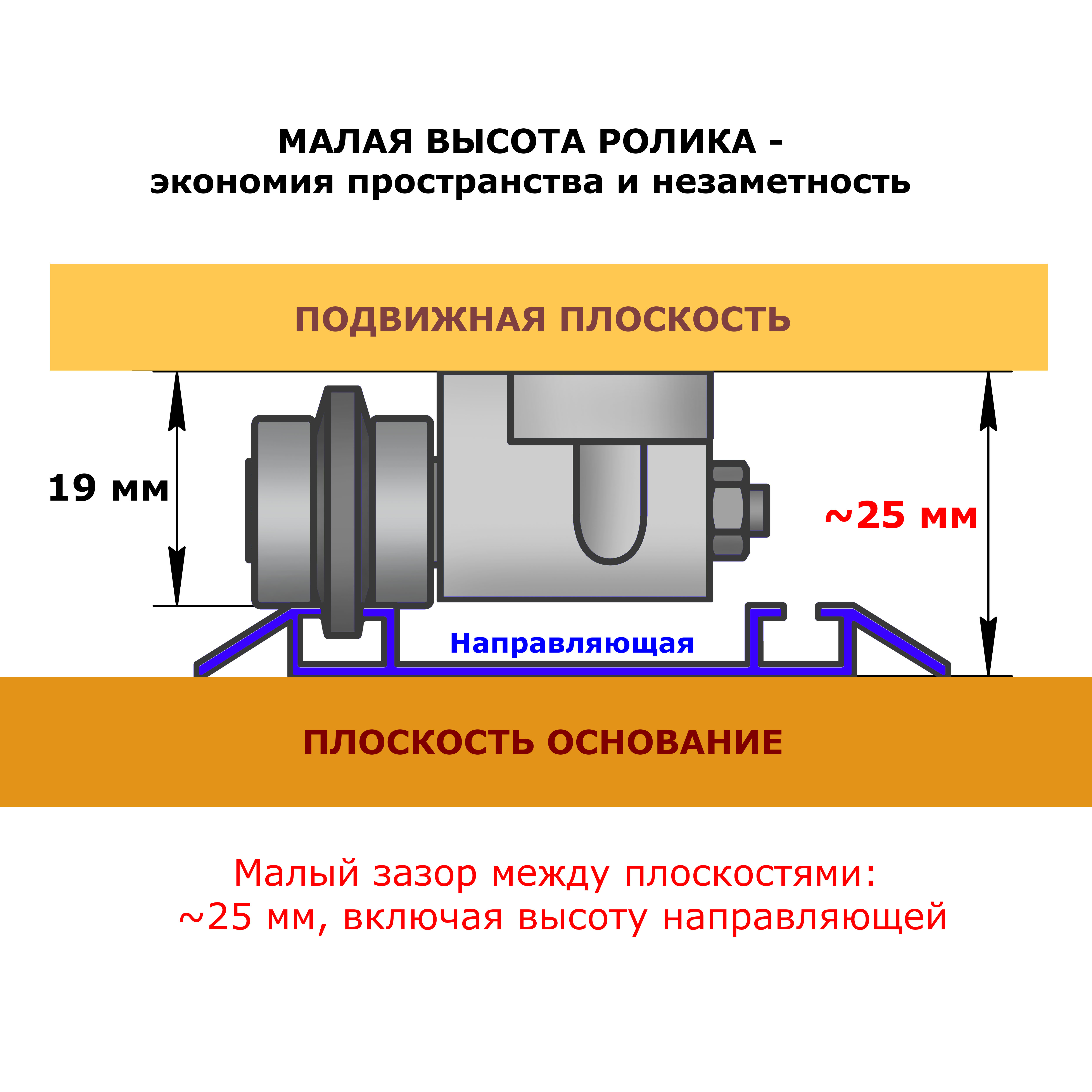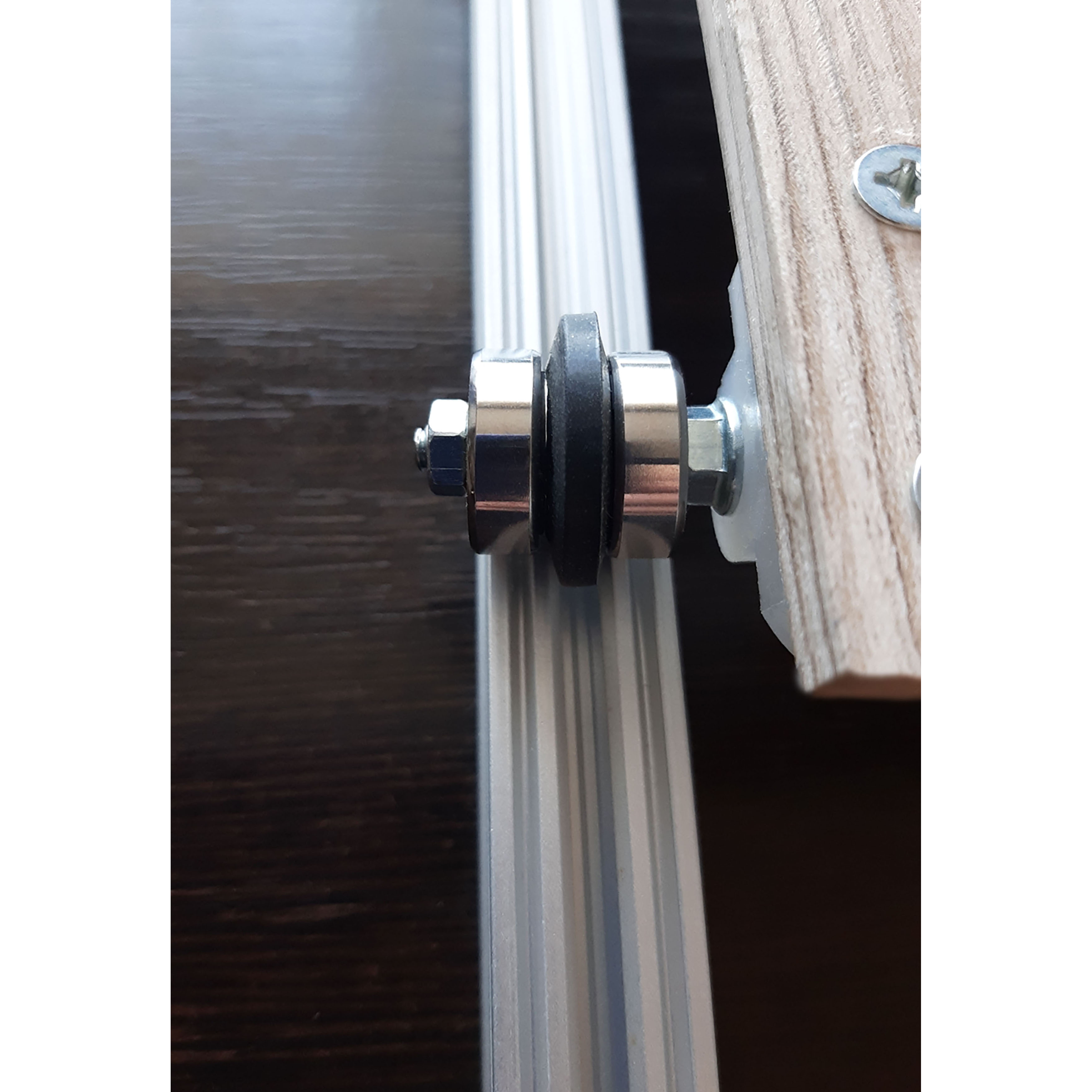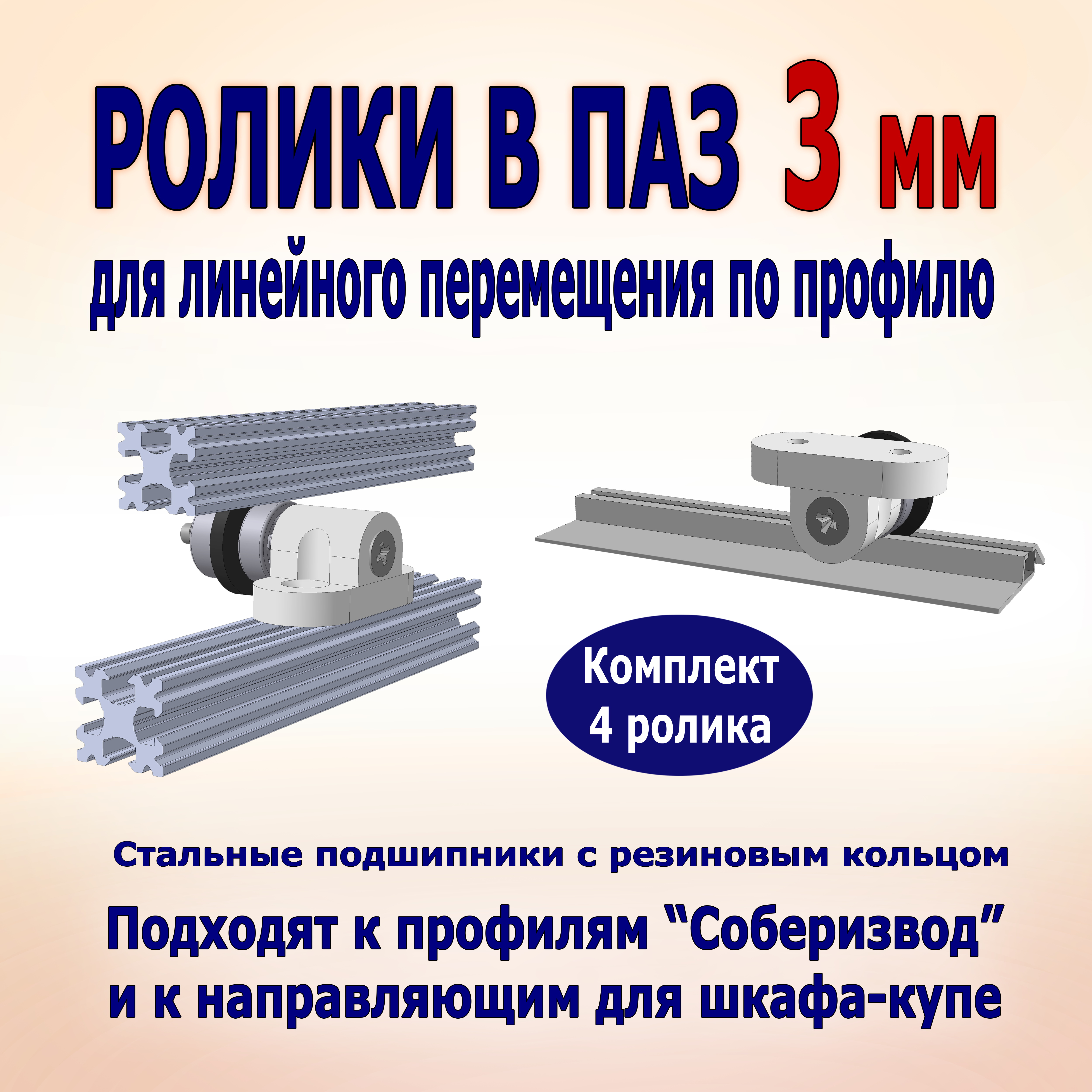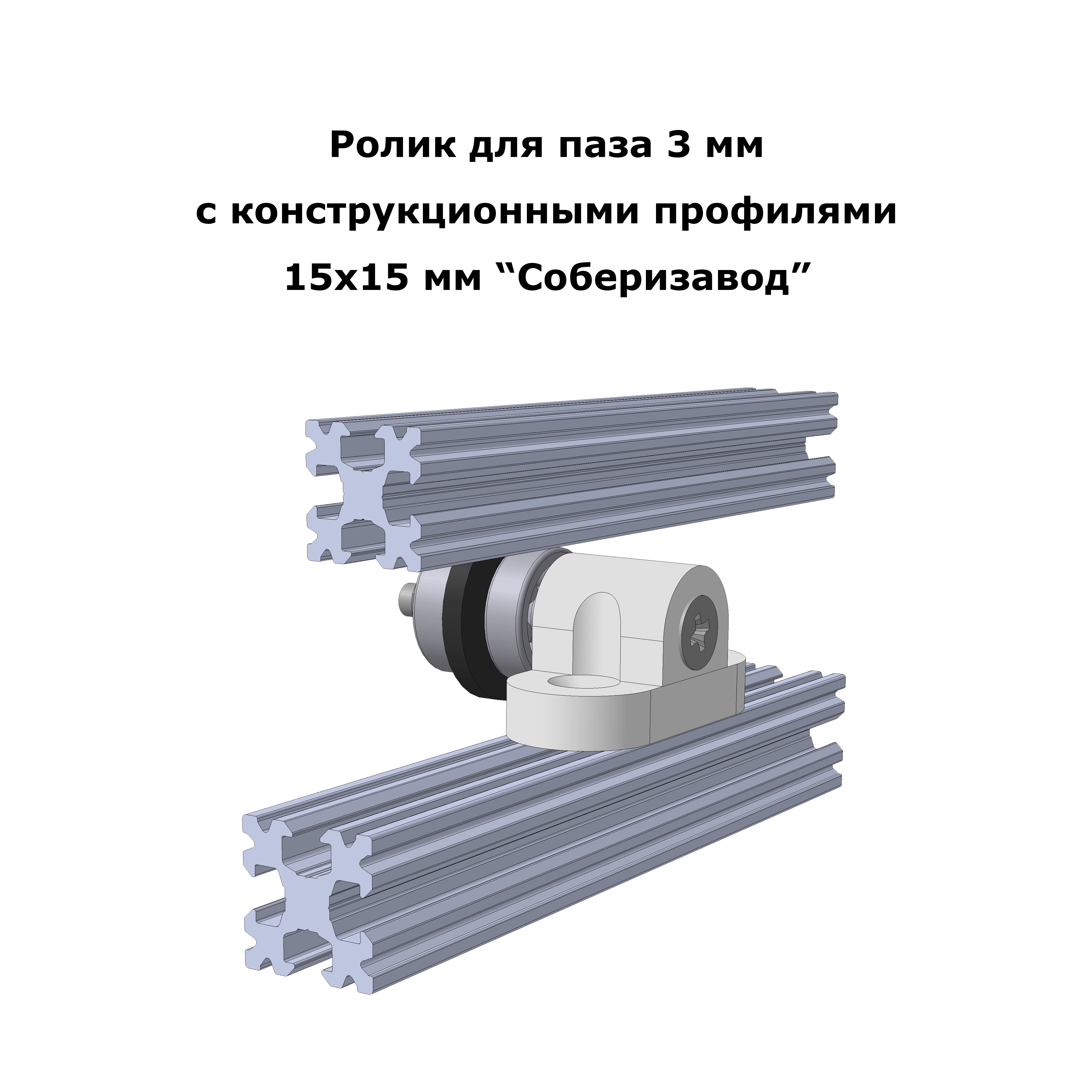 Ролики для линейного перемещения по направляющей или по конструкционному профилю. Подходят к профилю 15х15 мм марки Соберизавод (серия 15) и к стандартным направляющим шкафа купе (Версаль и аналоги), имеющим паз 3 мм. Стальные подшипники обеспечивают ровное качение, без вибраций. Пазовый выступ ролика - колесо из прочной резины, допускает небольшой перекос оси без заклинивания выступа внутри паза. Это удобно: незначительные ошибки при сборке не повлекут проблем с заеданием роликов в будущем. А плотная посадка внутри паза препятствует качанию роликов.