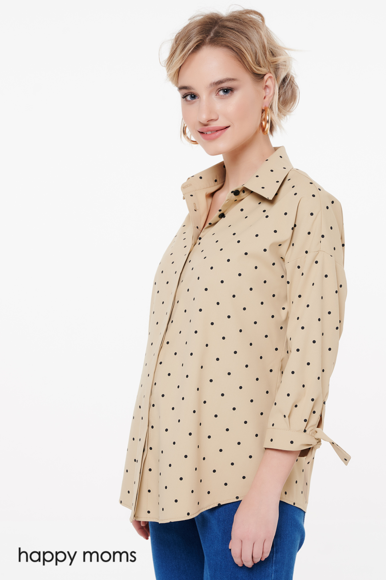 Бежевая рубашка в горошек с потайной (супатной) застежкой. Рубашечный воротник переходит в планку на пуговицах. Линия плеча приспущена, рукава длиной 3/4 заканчиваются манжетой в виде завязок. Низ рубашки фигурный, на спинке и передних полочках имеет закругленную к бокам форму. Крой рубашки прямой, свободный, не стеснит движений и обеспечит комфорт на любом сроке беременности. Идеальный повседневный вариант к юбкам, брюкам и джинсам, универсальность фасона предполагает отличную сочетаемость с разной обувью. Рубашка станет основой любого ансамбля, особенно хорошо впишется в актуальную стилистику «кэжуал».