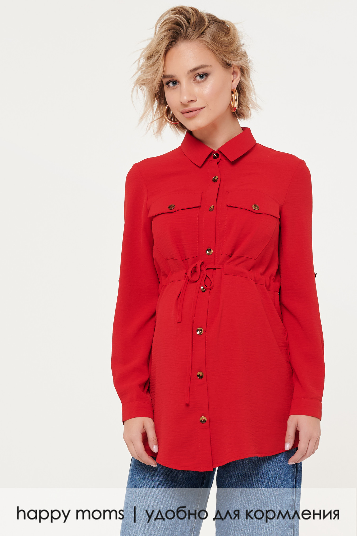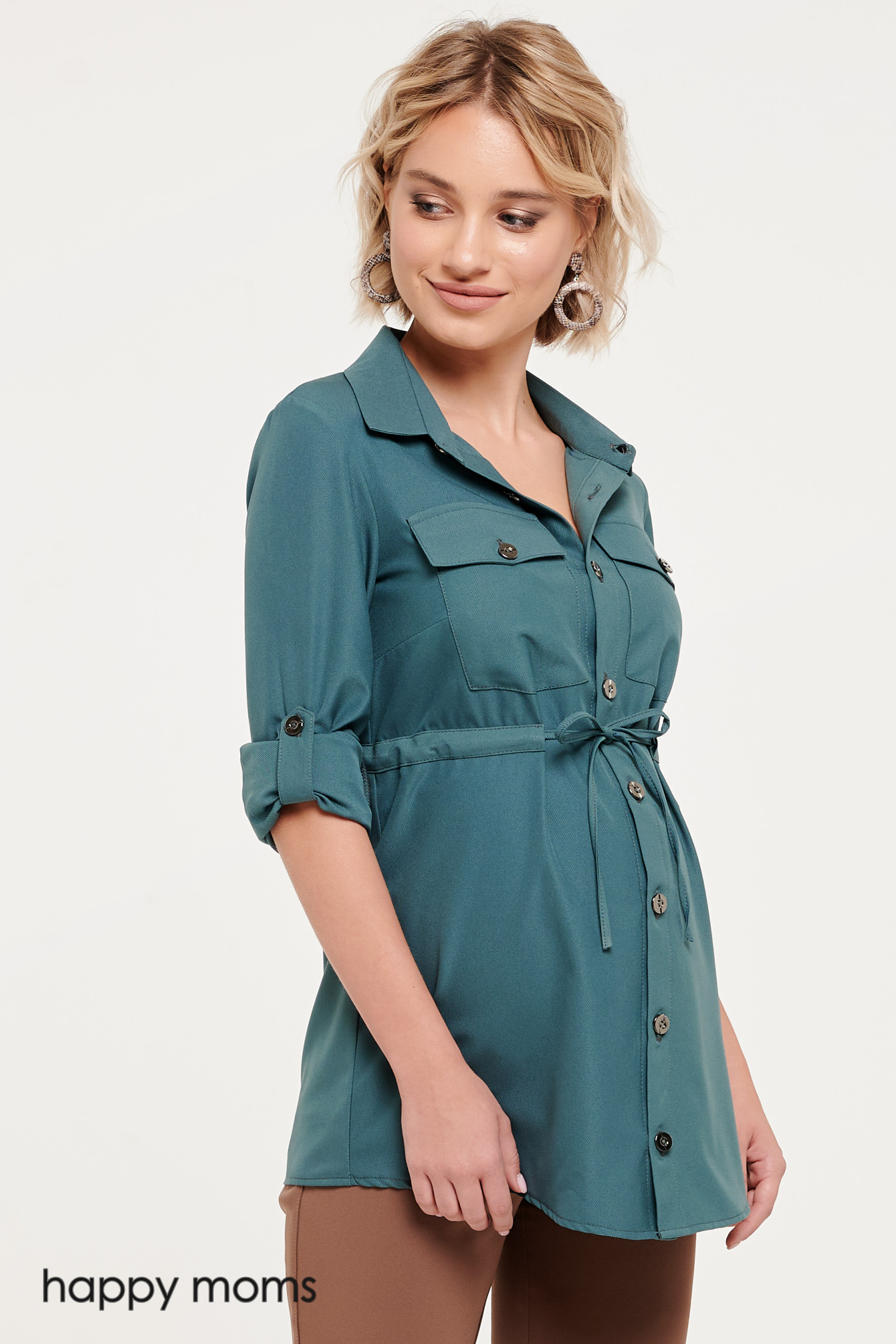 Фасон имитирует крой френча, есть отложной воротник, квадратные карманы с клапанами и выделенная планка на пуговицах. Крой дополнен вшитой в районе талии кулиской, она добавляет фасону женственности и позволяет фиксировать объем талии на разных сроках беременности. Модель носится навыпуск, подходит как под классические брюки и юбки, так и под джинсовый низ. Благодаря такой универсальности не будет проблем с подбором обуви: в зависимости от выбранного стиля, блузка может сочетаться с кроссовками, туфлями на любом ходу и классическими лодочками. Аксессуаров модель не требует, благодаря выразительному цвету и обилию деталей, фасон смотрится самодостаточным. Рукава можно зафиксировать в закатанном виде.