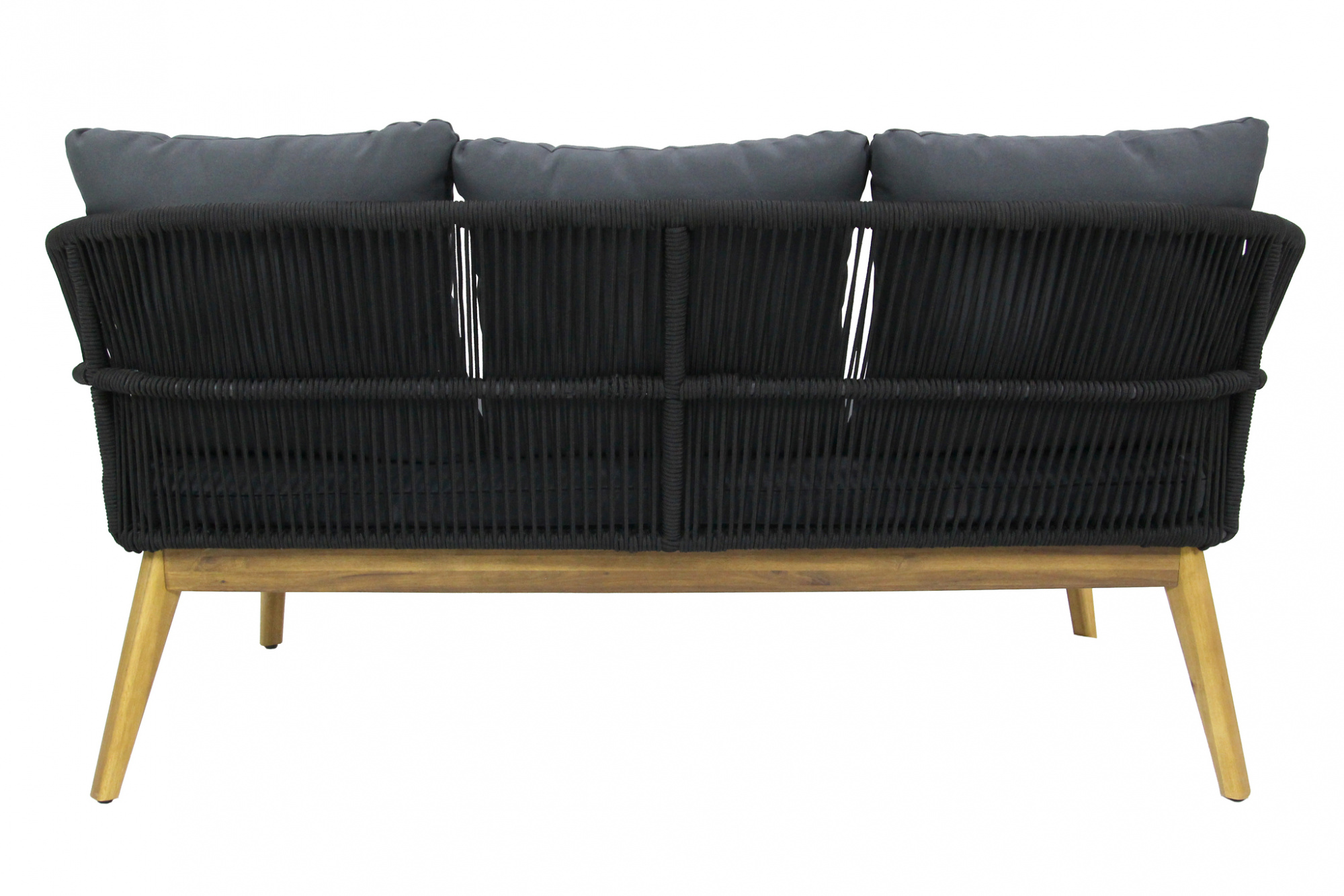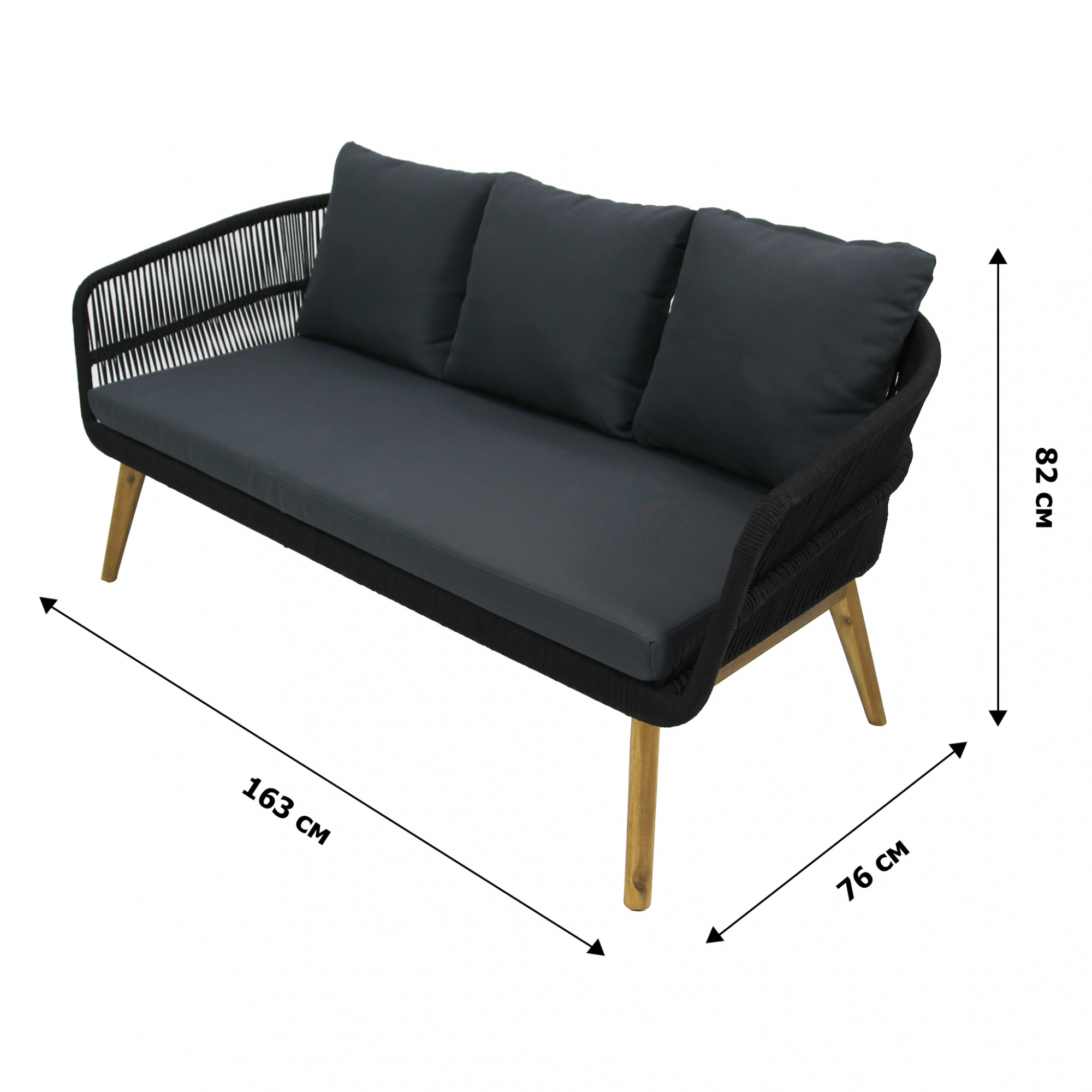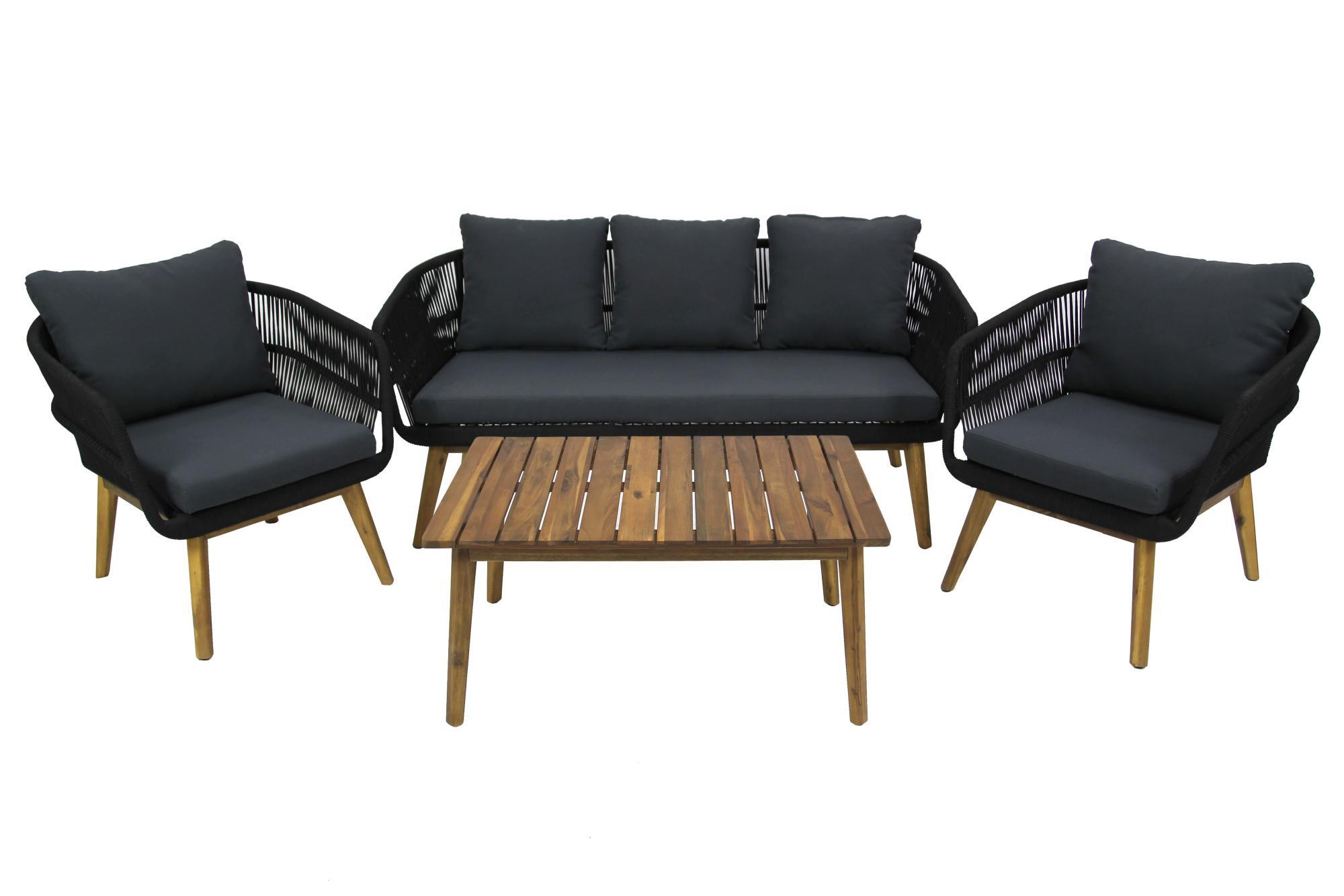 Набор «Камелия» сочетает в себе благородство натуральной акации и современные технологии плетения. Двухместный диван 76×163×82 см, парные кресла 76×73×82 см и кофейный стол 60×90×44 см образуют органичную композицию для отдыха в саду или на террасе. Теплый тон массива дерева контрастирует с графитовым оттенком синтетического жгута, создавая сбалансированный эстетический образ.