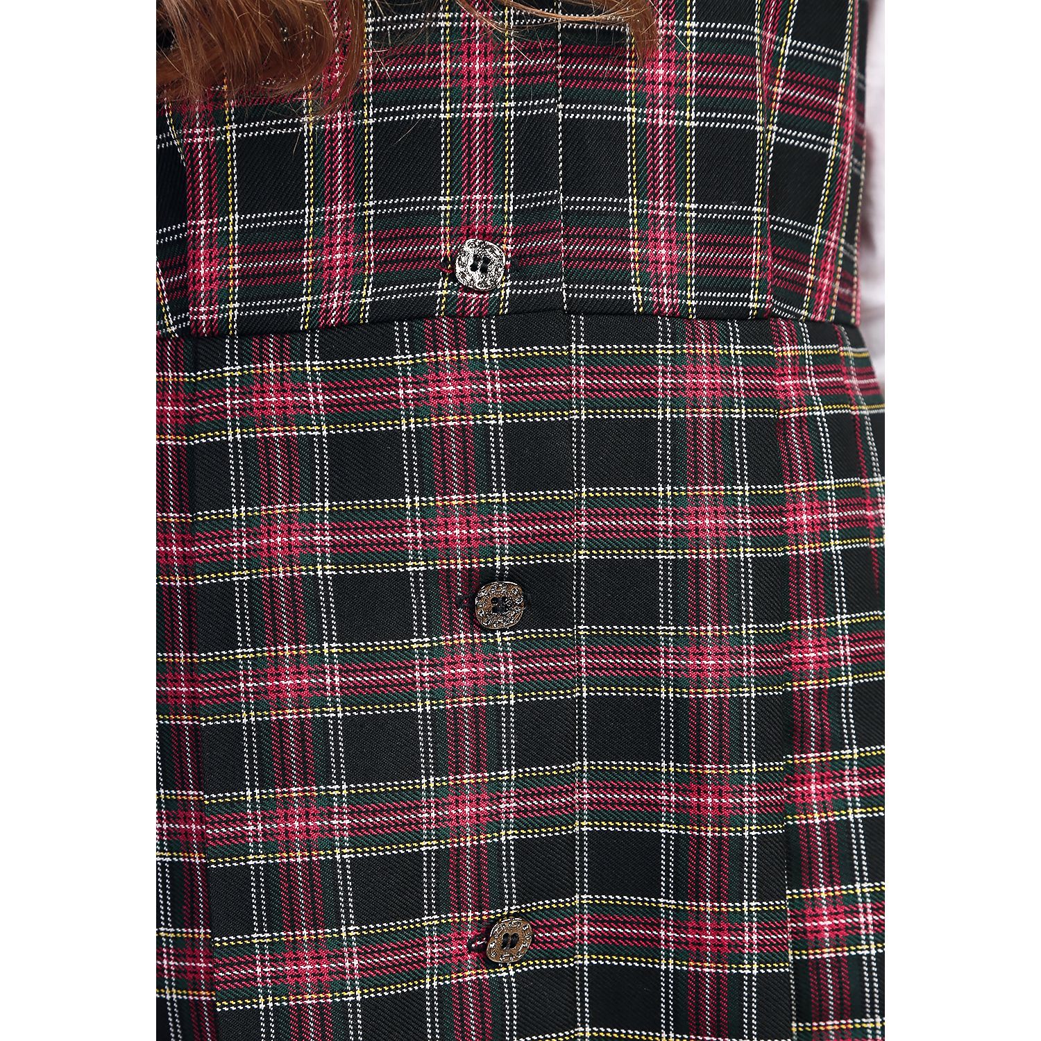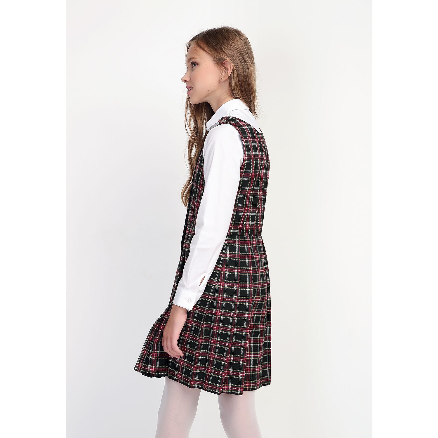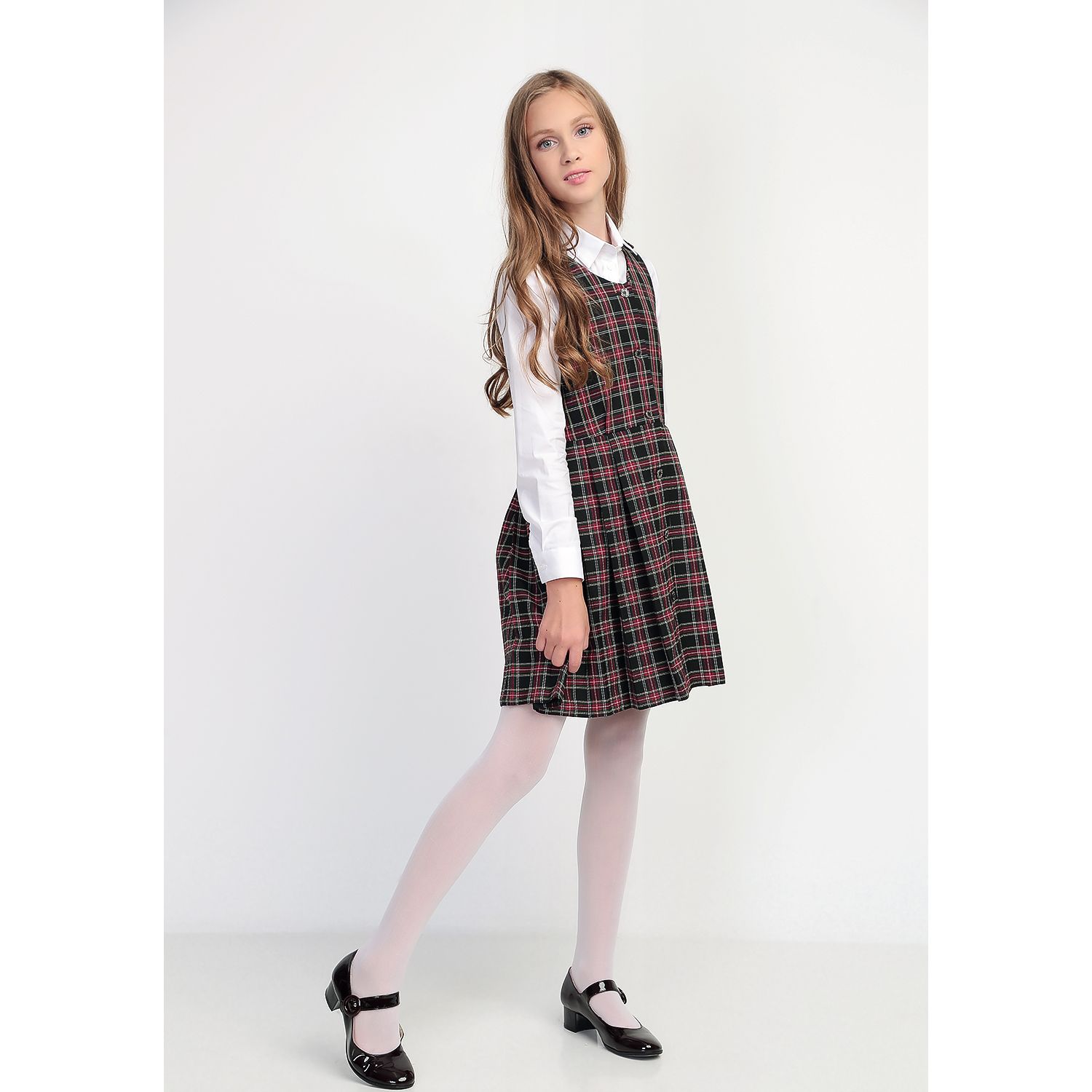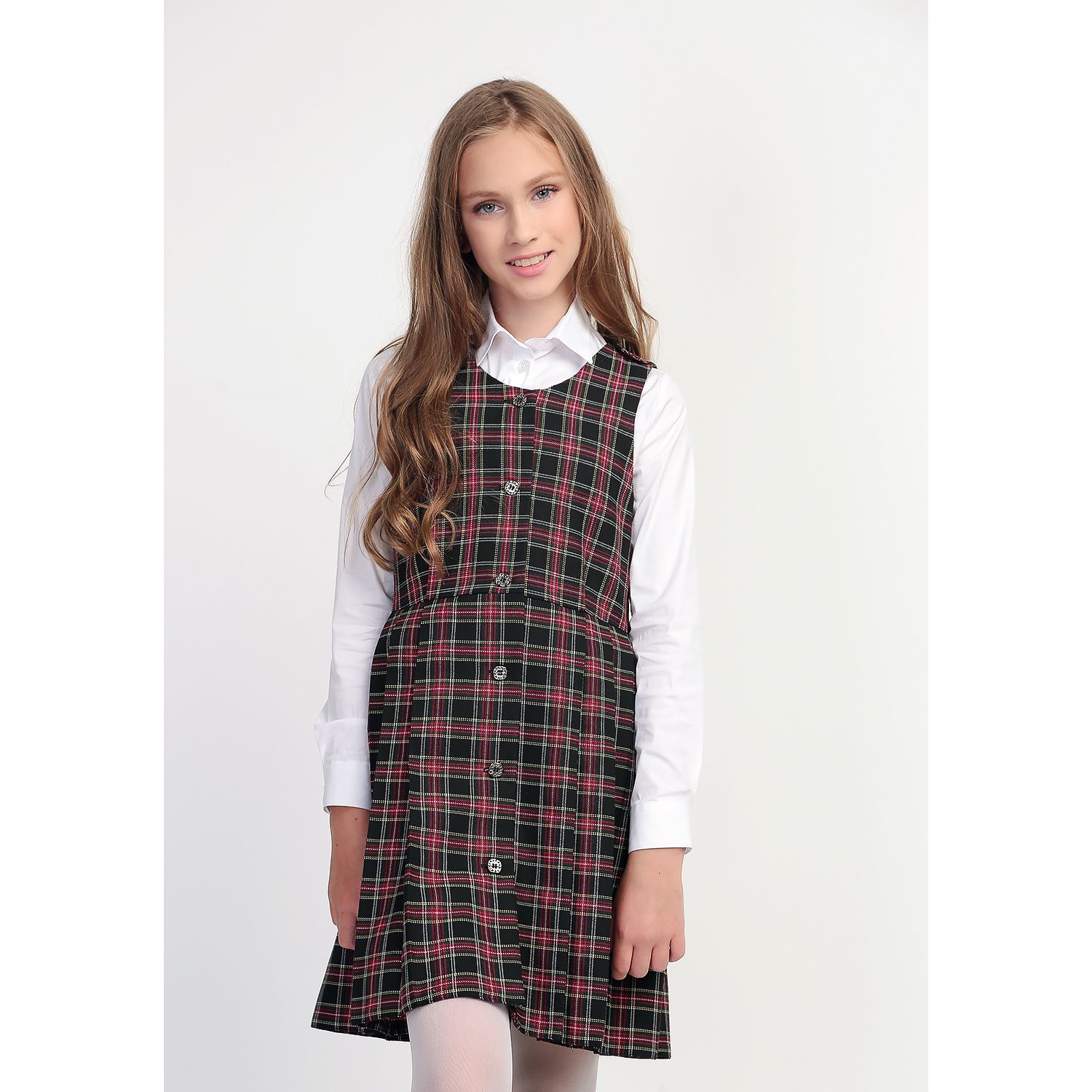 Сарафан на девочку, в черно-красную и черно-бордовую клетку, распашной (халатиком) в складку. Без крылышек. Спереди — застежка на пуговицы. Доступен из черно-красной или черно-бордовой клетки, незначительно отличающейся оттенком.