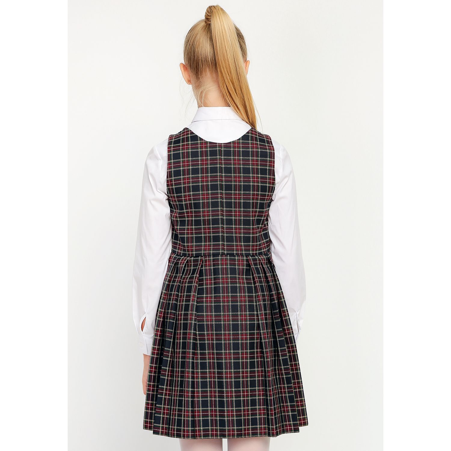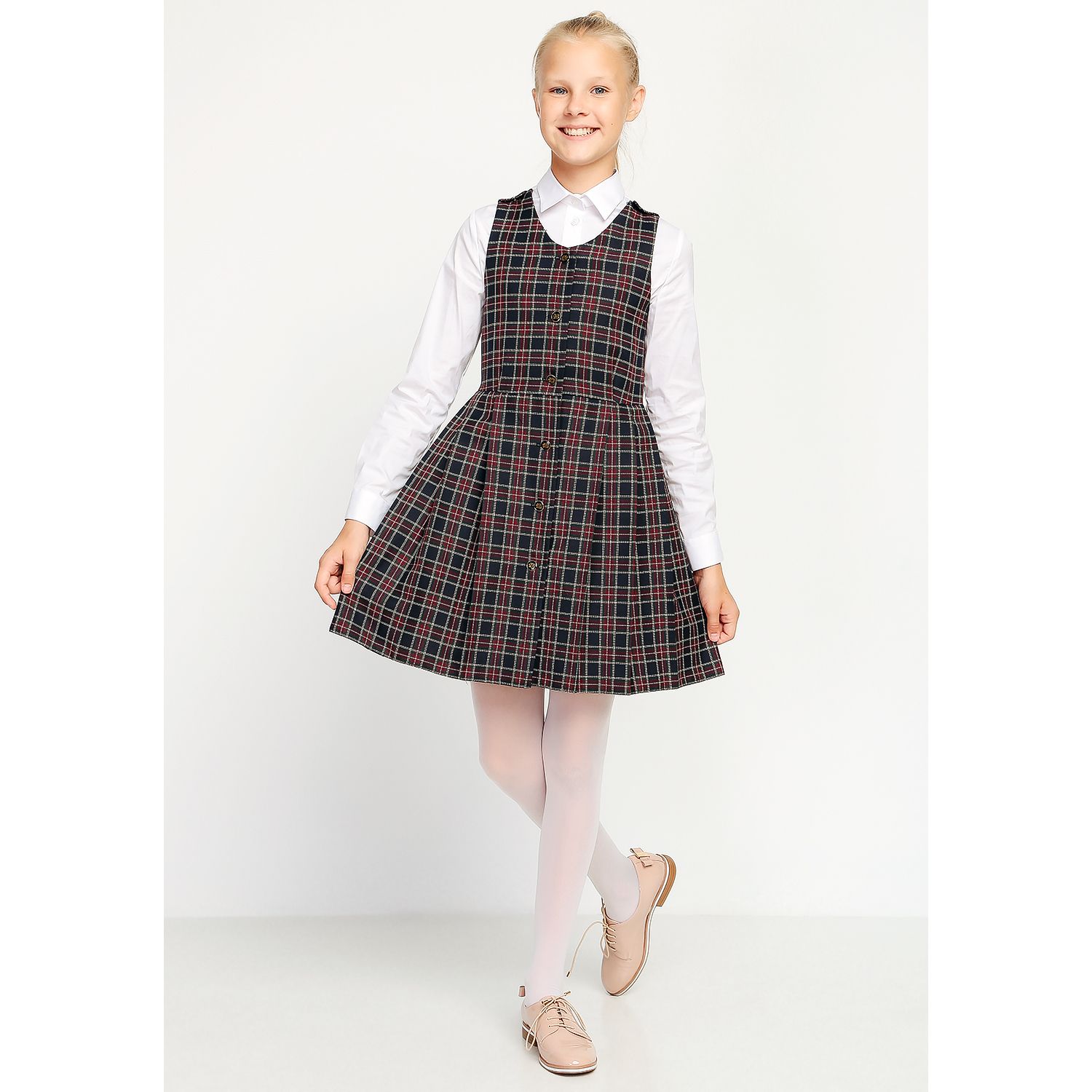 Сарафан на девочку, в сине-фиолетовую клеточку (цвета «черника»), распашной (халатиком) в складку. Без крылышек. Спереди — застежка на пуговицы.