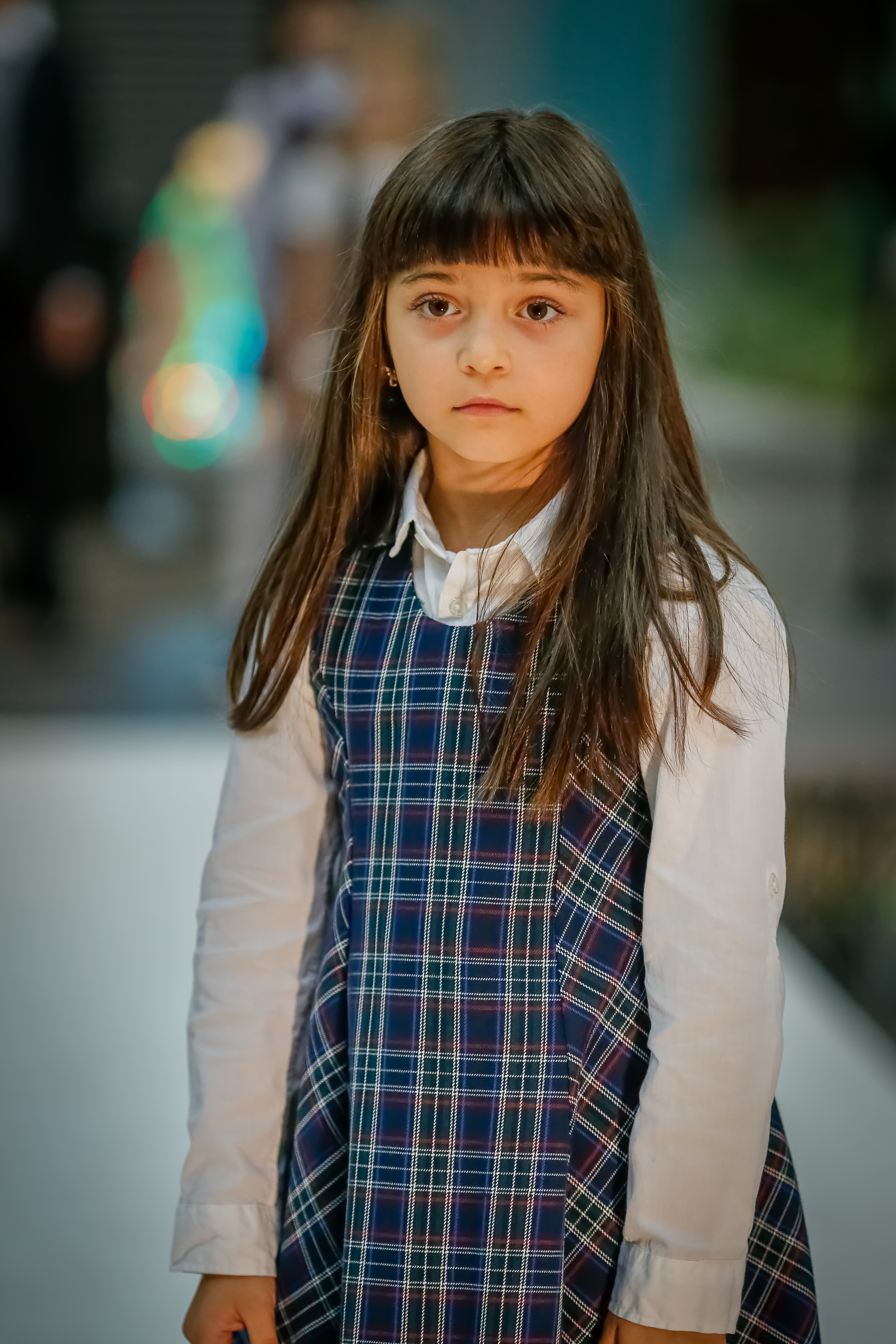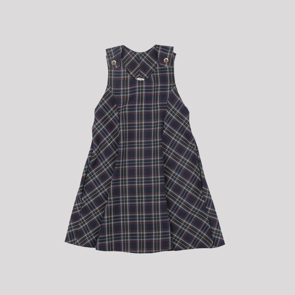 Сарафан на девочку, в сине-белую клетку, расклешенный. Без крылышек. По плечам застежка на пуговицах. Сзади — потайная молния.