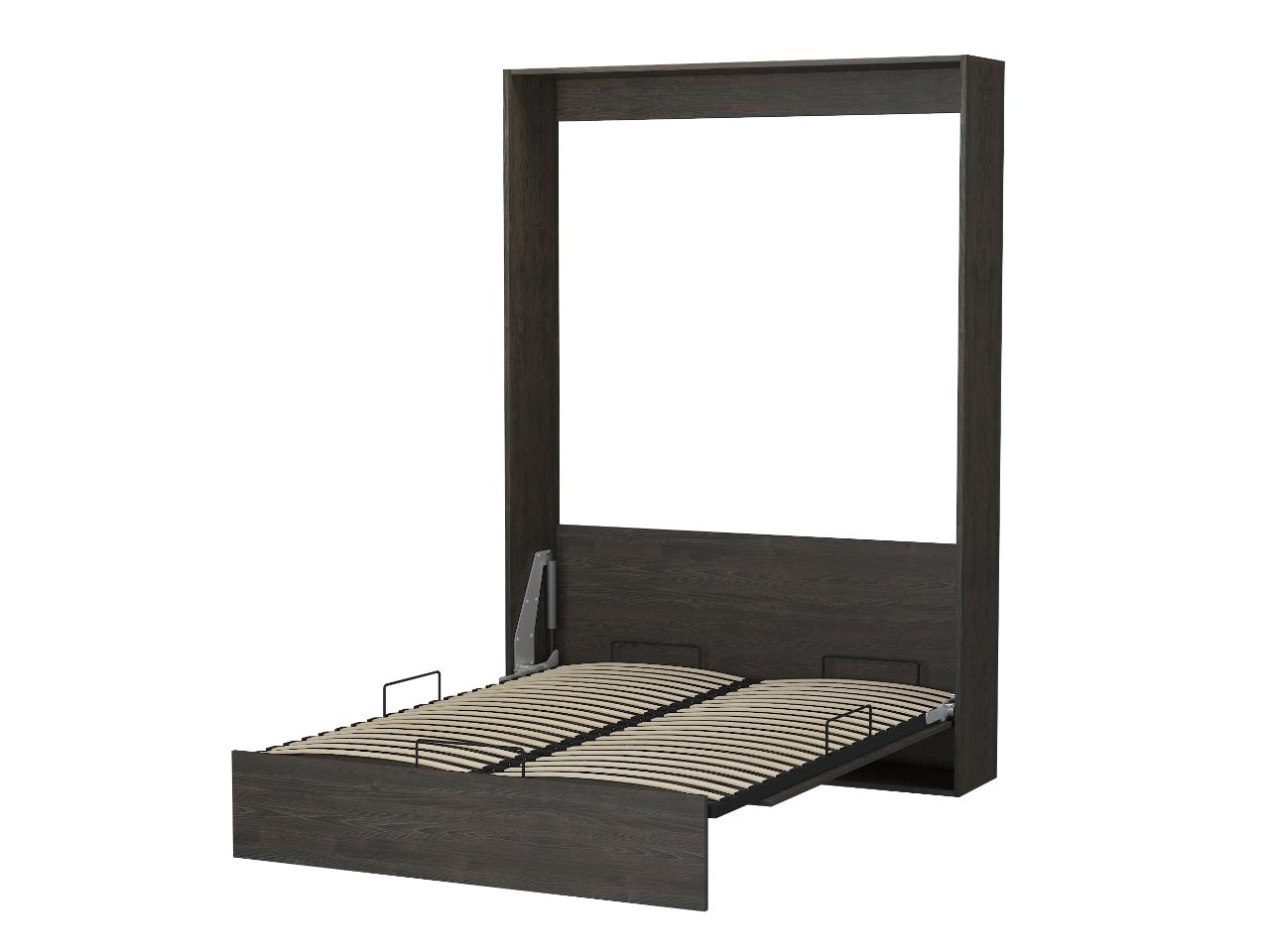 Конструкция представлена в цвете венге, а основание кровати сделано из деревянных ламелей.