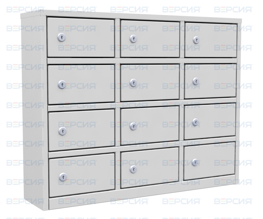 На 12 ячеек. Отличный вариант для установки в помещениях различного типа. Все ячейки шкафа индивидуальные и закрываются на замок. Доступ к ним имеет только владелец ячейки.