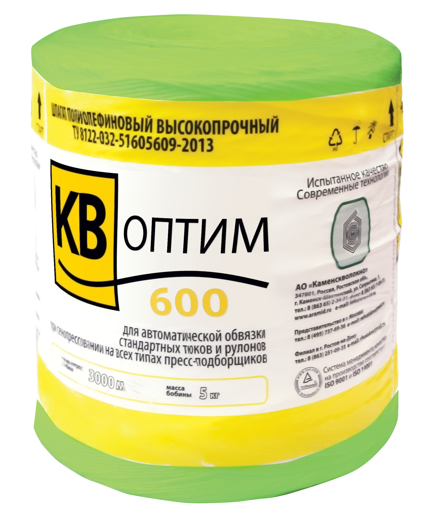 Шпагат полиолефиновый высокопрочный, линейной плотности 1700 текс, выпускается под маркой КВ ОПТИМ 600. Основная сфера применения — сенопрессование на рулонных пресс-подборщиках.