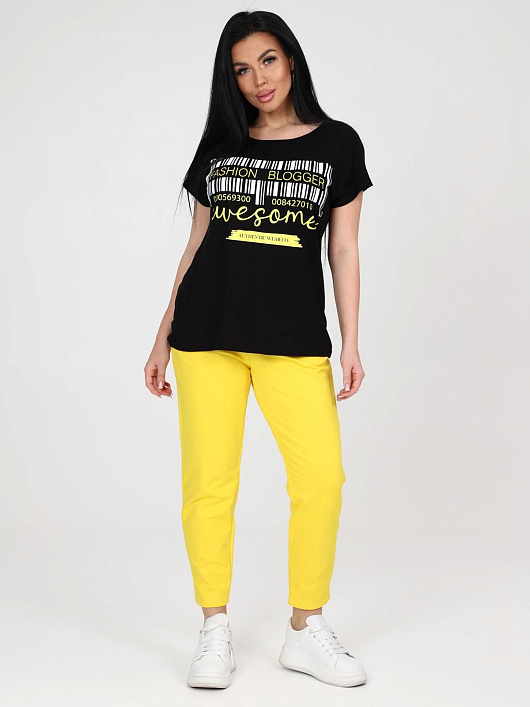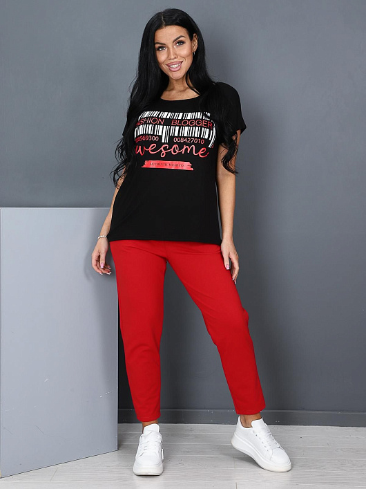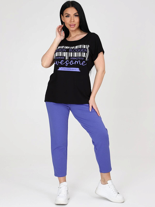Футболка - Вискоза (Вискоза 95%; Лайкра 5%). Брюки - Футер двунитка (Хлопок 75%; Полиэстер 20%; Лайкра 5%). Брюки длиной 7/8,пояс на эластичной тесьме,в боковых швах карманы. Футболка прямого силуэта со спущенной линией плеча и круглым окантованным вырезом горловины. Оптовая цена действует при заказе от 10 тысяч рублей на всю корзину товаров. минимальная сумма заказа 2 тысячи рублей. Заказ размерными рядами не обязателен. Доставка: Самовывоз, почта или ТК. Доставка до терминала ТК бесплатно.