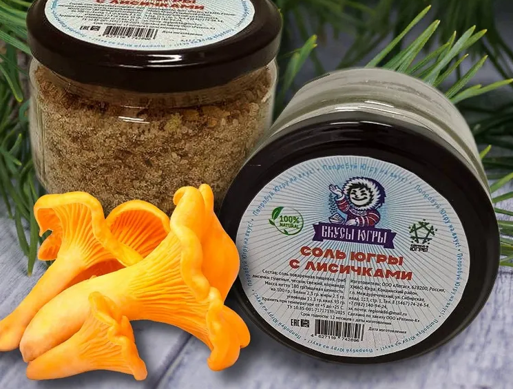 Соль Югры с лисичками от компании Регион-К "Дары Югры". Место сбора дикоросов Ханты-Мансийский автономный округ - Югра. Состав: гриб лисичка, соль поваренная пищевая, чеснок свежий, кориандр.