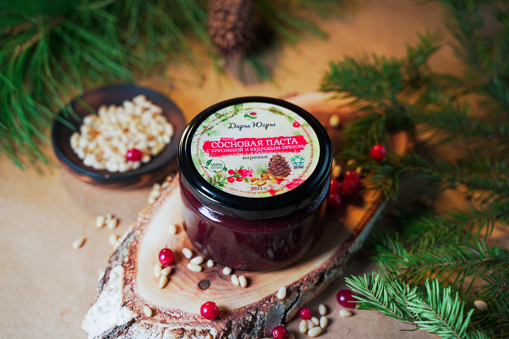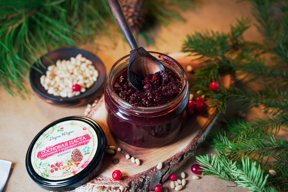 Сосновая паста из молодых сосновых шишек с лесной - дикорастущей брусникой и кедровым орехом, от компании Регион-К "Дары Югры". Место сбора дикоросов Ханты-Мансийский автономный округ - Югра. Состав: молодая шишка сосны, брусника лесная, ядро кедрового ореха, сахар, вода.