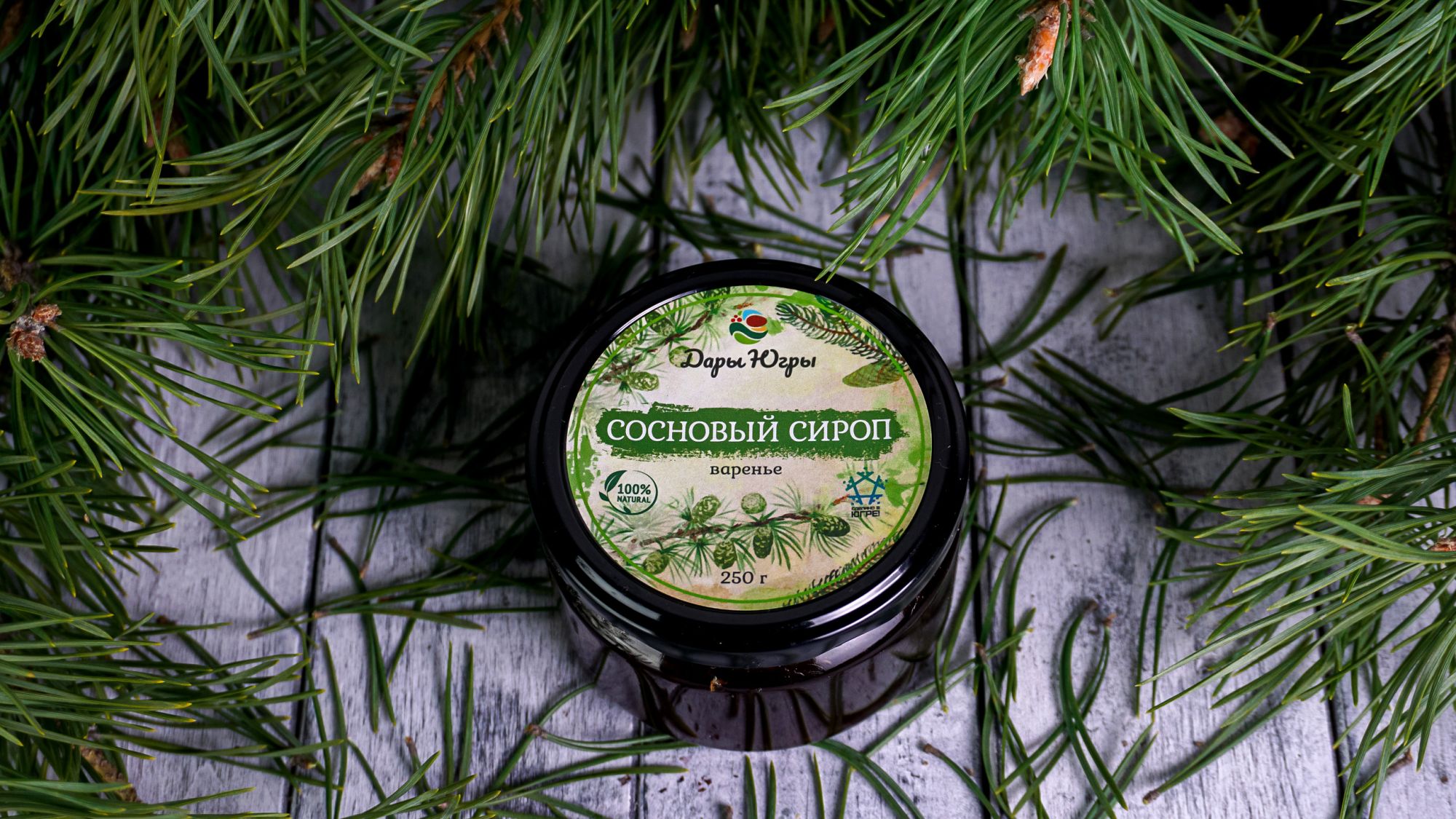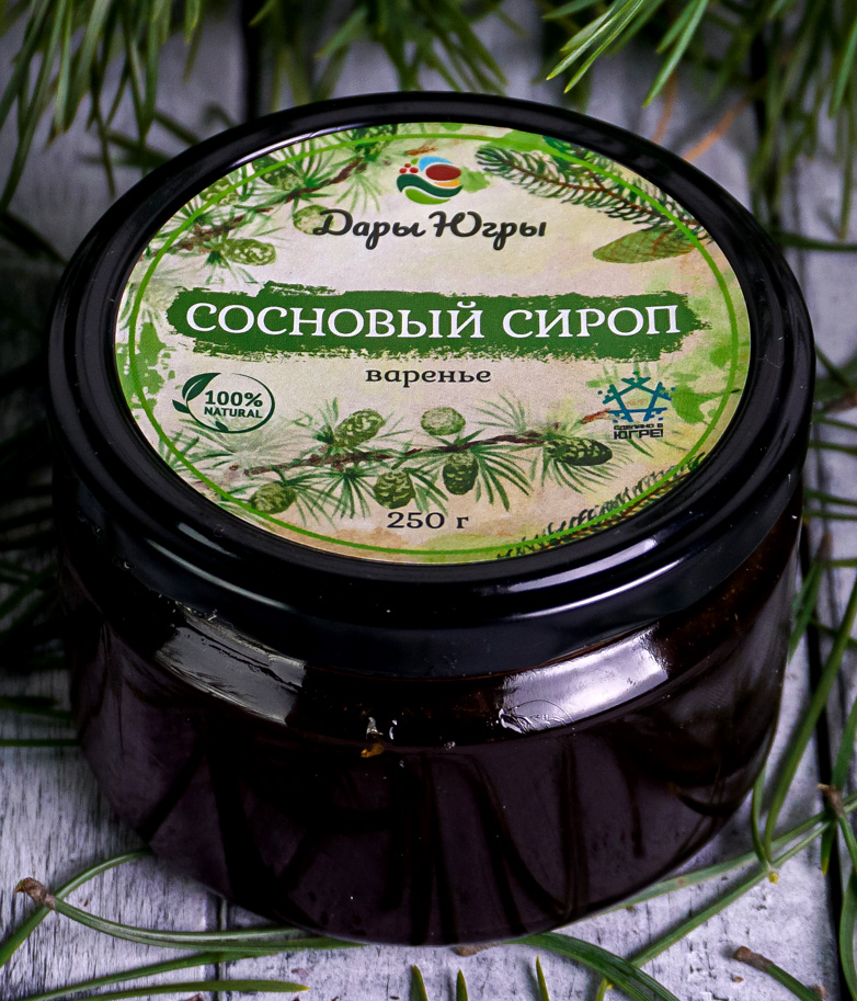 Сосновый сироп из молодых сосновых шишек от компании Регион-К "Дары Югры". Место сбора дикоросов Ханты-Мансийский автономный округ - Югра. Состав: молодая шишка сосны, сахар, вода.
