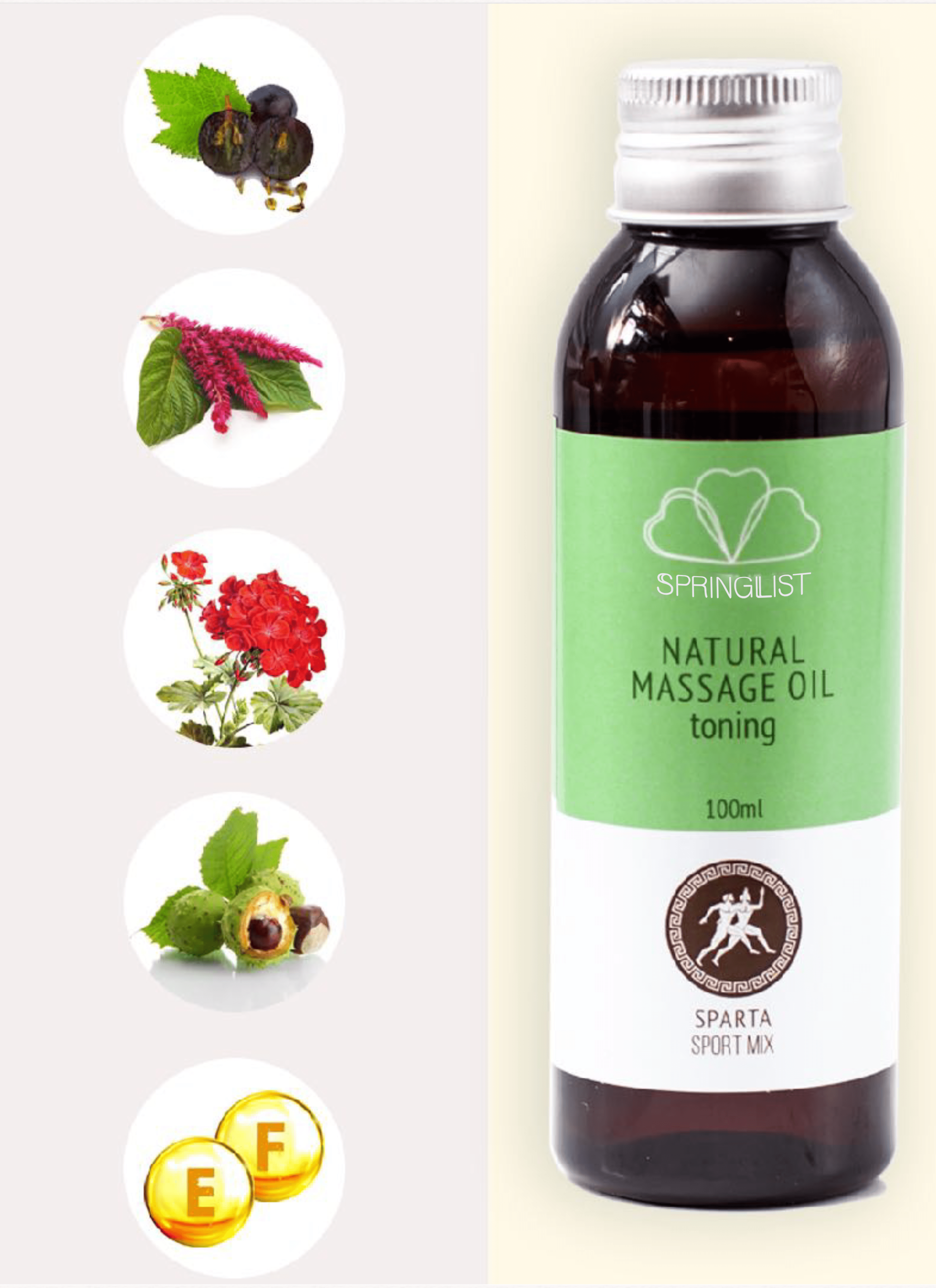 В составе: масло базовое виноградной косточки; масло базовое амаранта; масло эфирные ладан, герань, лаванда, мята; экстракты сабельника, бадяги, конского каштана, розмарина; витаминами E и F; крафт упаковка.