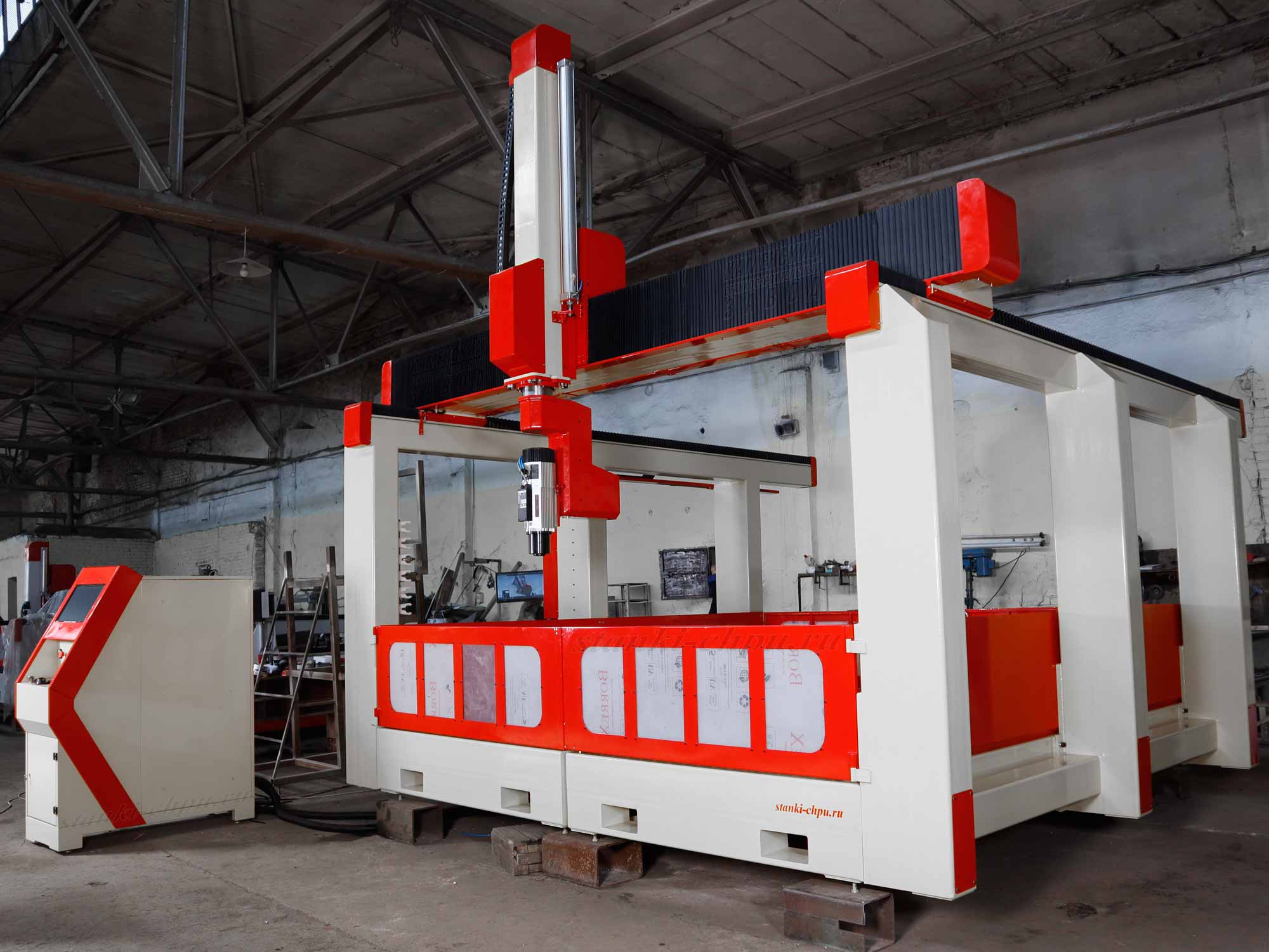 Станок имеет внушительные габариты и позволяет выполнять фрезерную обработку изделий больших размеров. Станок имеет рабочий ход осей от 2х2 м до 2х4 м и 1.2 м по высоте.