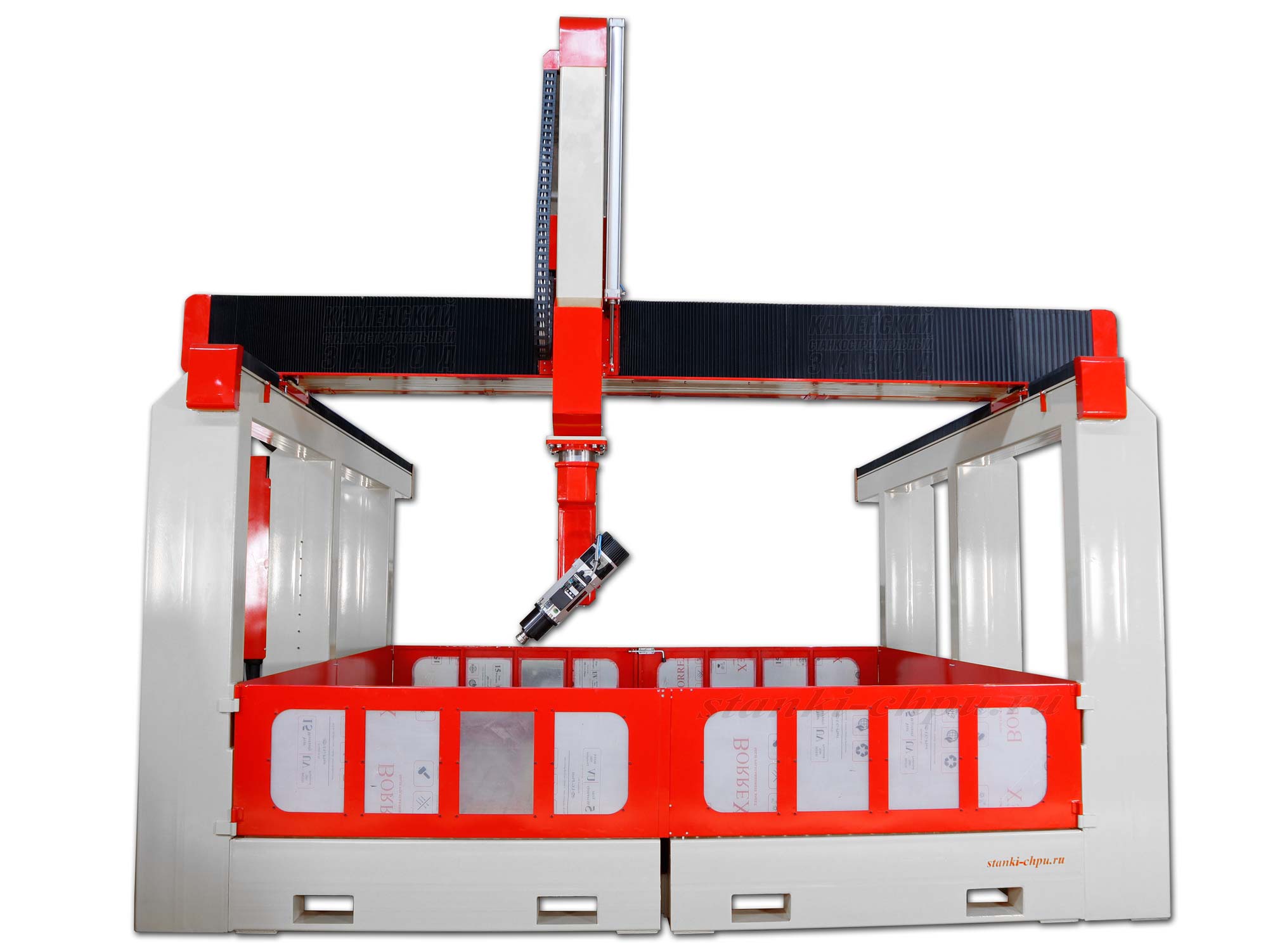 Станок имеет внушительные габариты и позволяет выполнять фрезерную обработку изделий больших размеров. Станок имеет рабочий ход осей от 2х2 м до 2х4 м и 1.2 м по высоте.