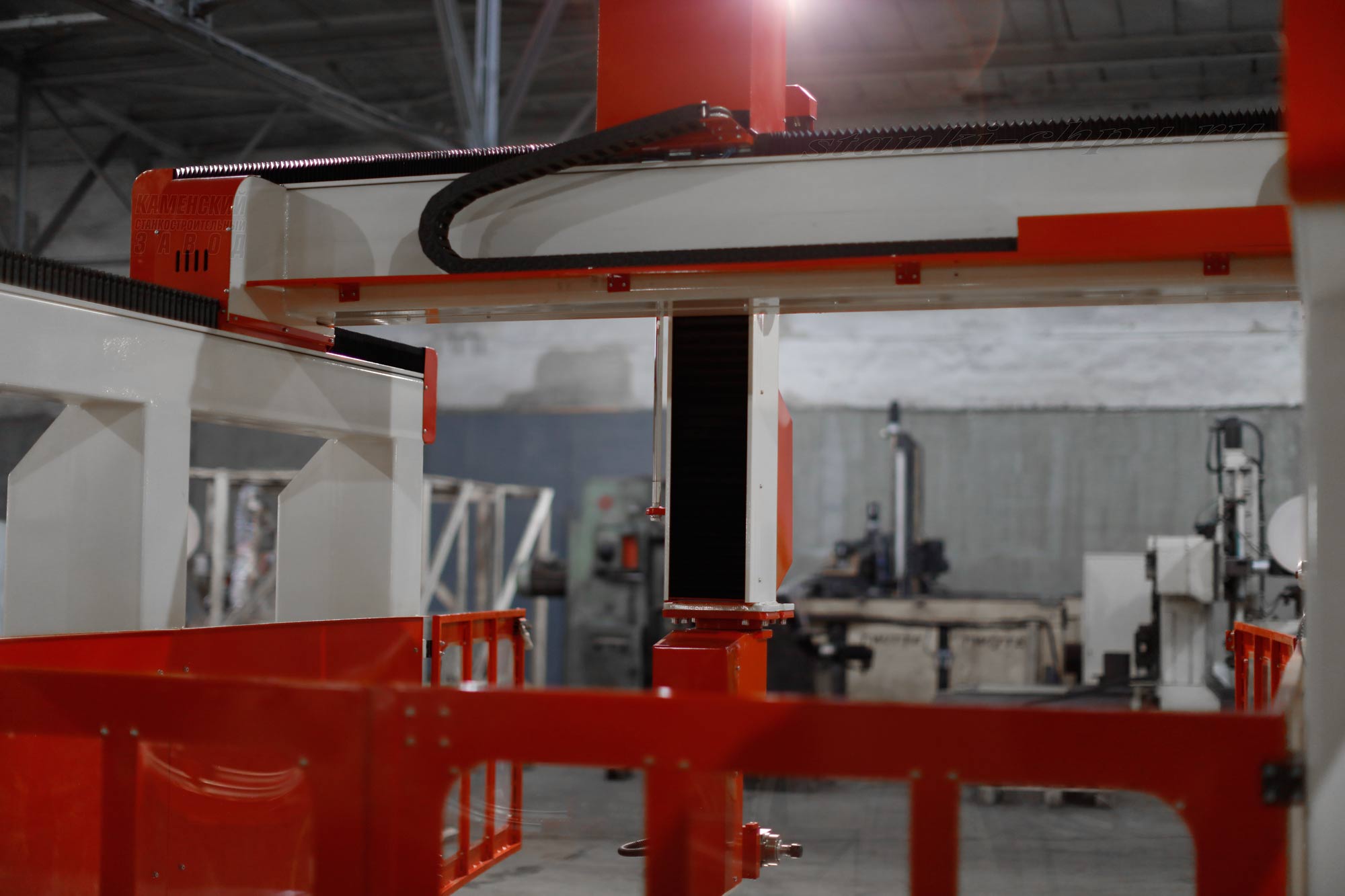 Рама станка сварная, изготовлена из стальных профильных труб. Рамы фрезеруеются на станках нашего производства. Выполнена фрезеровка площадок под направляющие, что обеспечивает повышенную точность работы станка. По оси Y используется сдвоенный привод. На станке 17K установлены качественные рельсовые направляющие, редукторы, систему привода, рейки и шестерни.