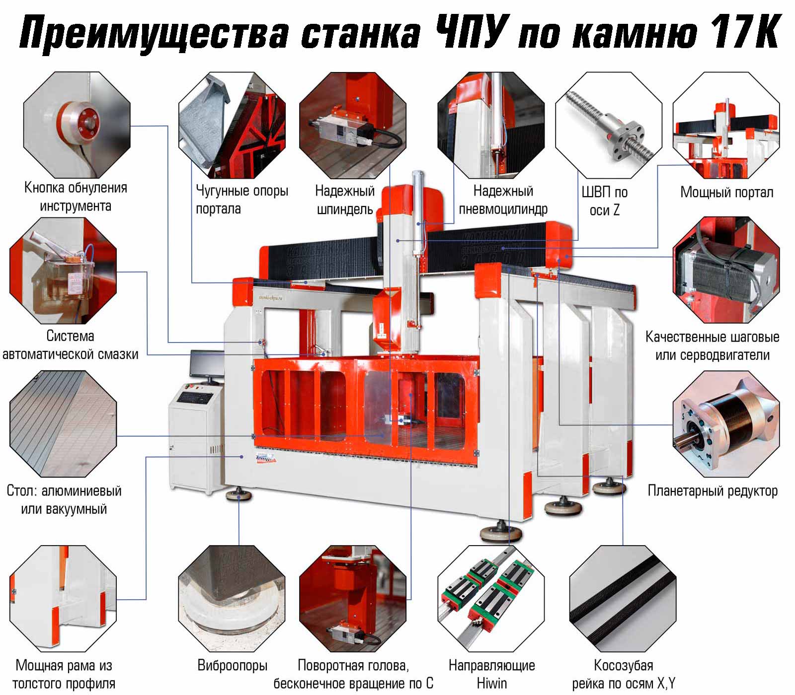 Рама станка сварная, изготовлена из стальных профильных труб. Рамы фрезеруеются на станках нашего производства. Выполнена фрезеровка площадок под направляющие, что обеспечивает повышенную точность работы станка. По оси Y используется сдвоенный привод. На станке 17K установлены качественные рельсовые направляющие, редукторы, систему привода, рейки и шестерни.