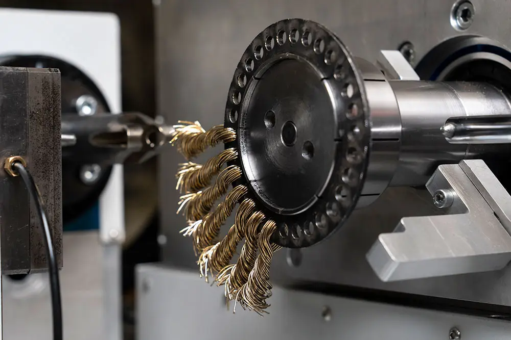 Станок производства корщеток предназначен для изготовления металлических дисков с небольшими отверстиями, расположенными по кругу, в которые продеваются и закручиваются пучки жесткой проволоки. Подобные щетки используются для обработки различных материалов при помощи ручного инструмента типа угловой шлифовальной машины (болгарки).