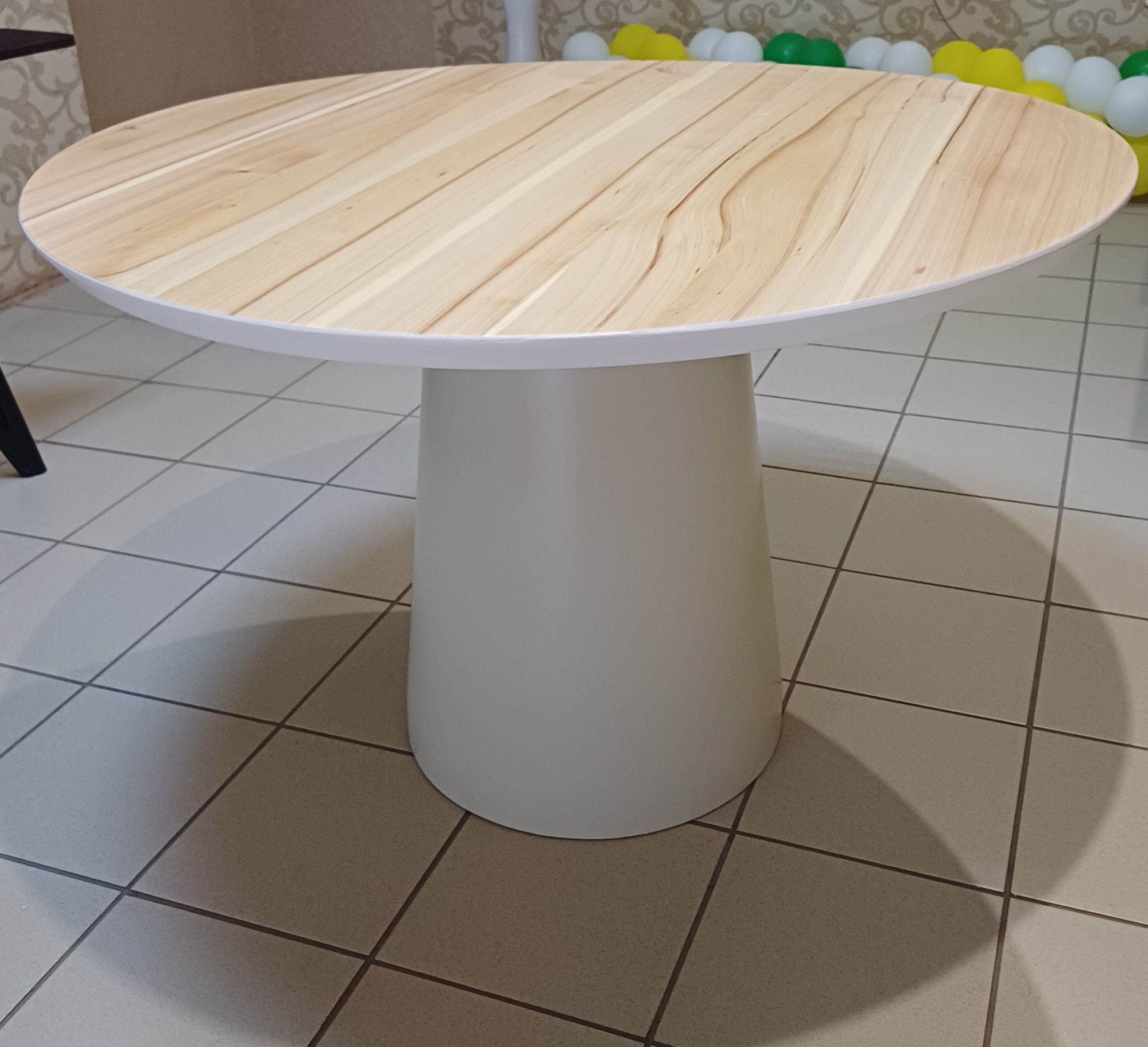 Дизайнерская работа: конусное подстолье выполнено из берёзы и покрыто эмалью, материал столешницы - МДФ, ламель карагача 5 мм. Высота - 76 см. Диаметр - 115см.